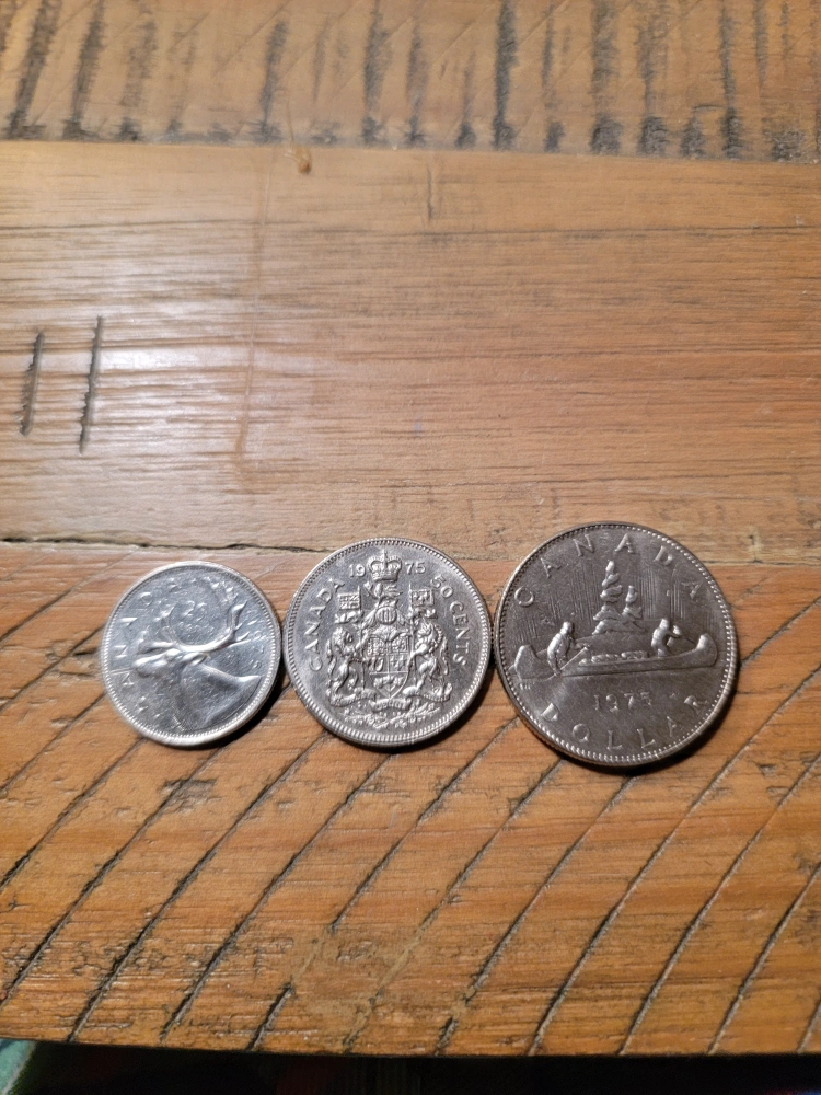 Three vintage Canadian coins. One 25-cent piece, one 50-cent piece, and one dollar coin Date 1975.