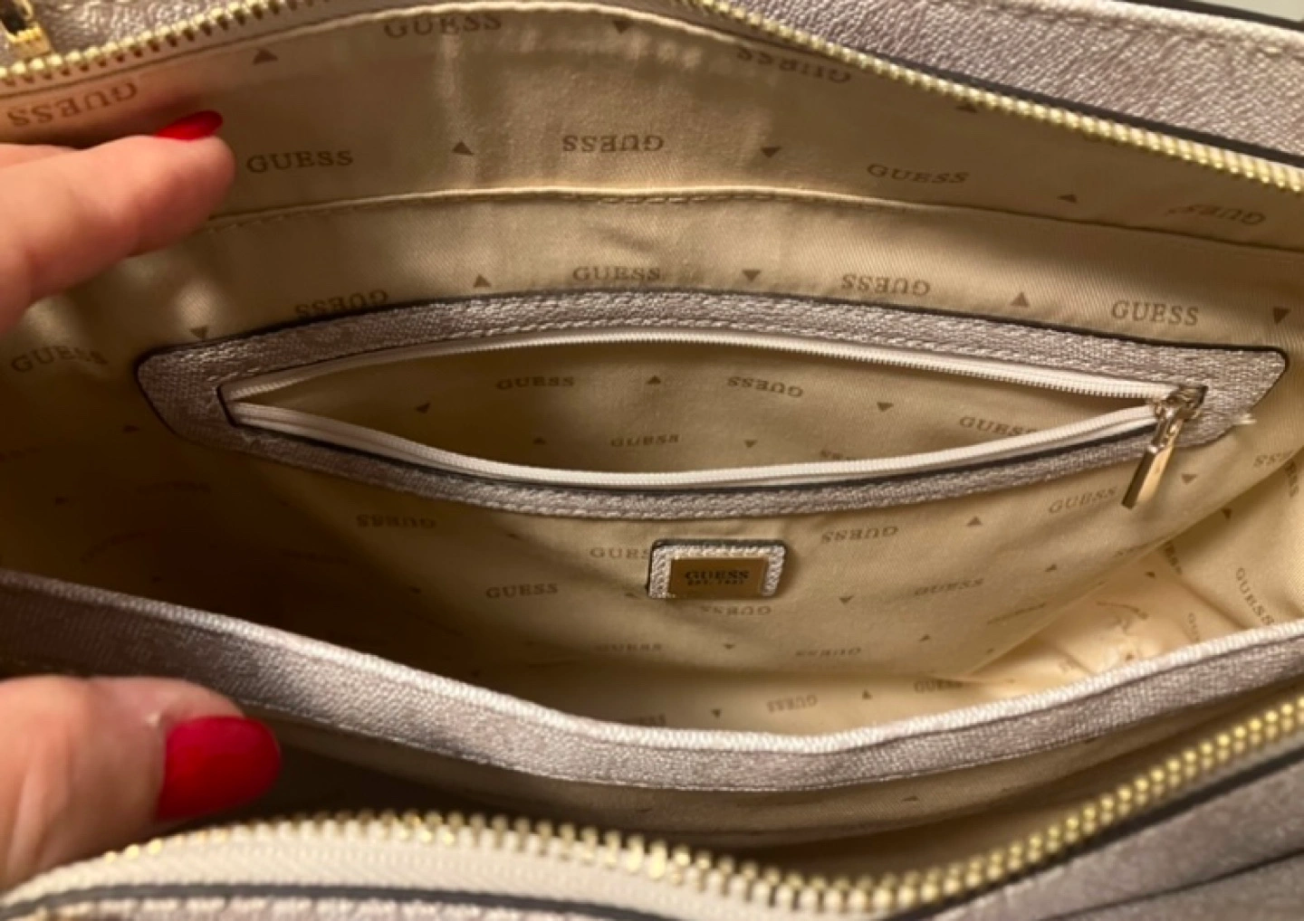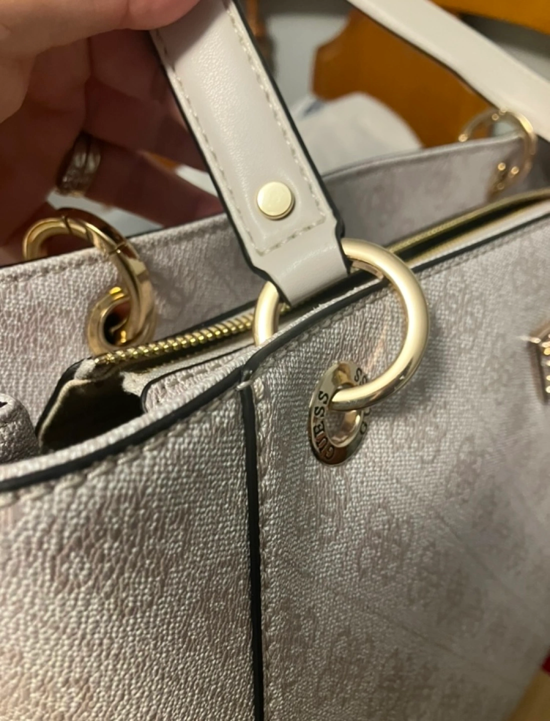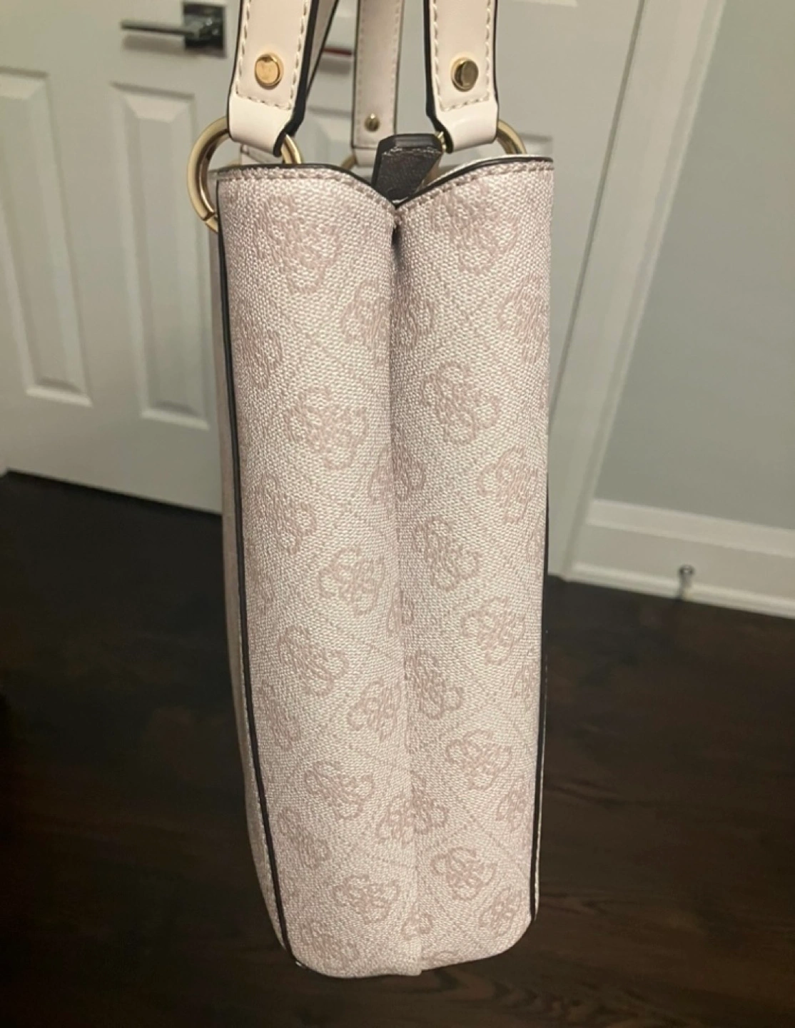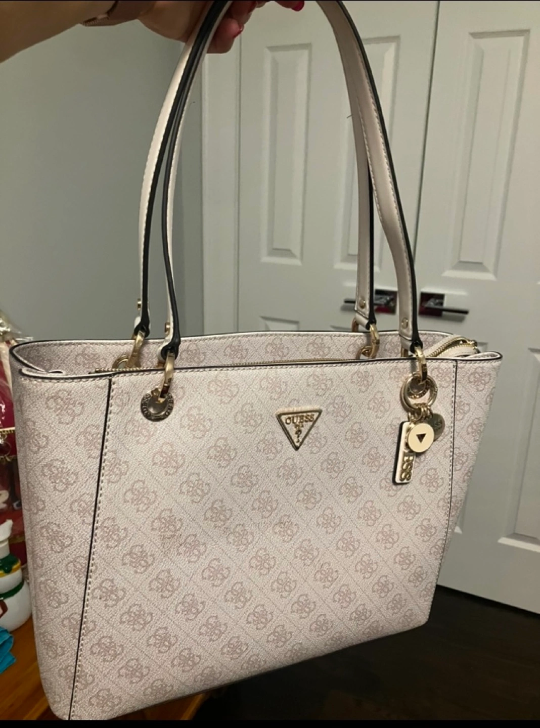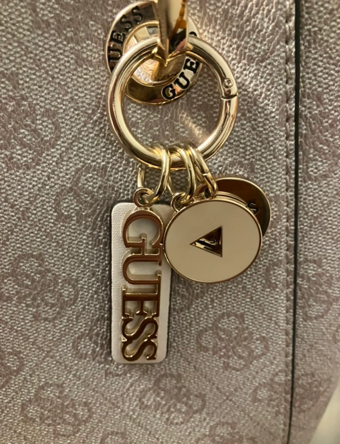 Stylish tote bag. New. Features two top handles, zip closure, and gold-tone hardware. All-over Guess logo print. Includes a Guess charm.