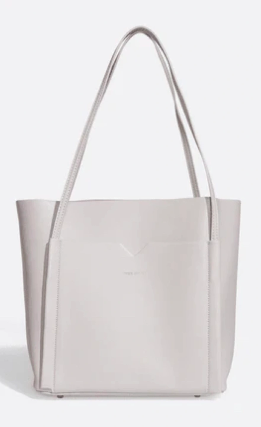 Light grey vegan shoulder tote bag. Comes with front and back pockets with a sleek design. Has a removable pouch inside that is held by snap button.