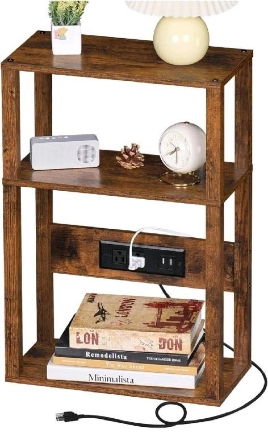 Three-shelf nightstand. Rustic brown finish. Built-in power strip with two AC outlets and two USB ports. Perfect for bedside or living room. Dimensions: 15.75in x 14.17in x 23.62in.