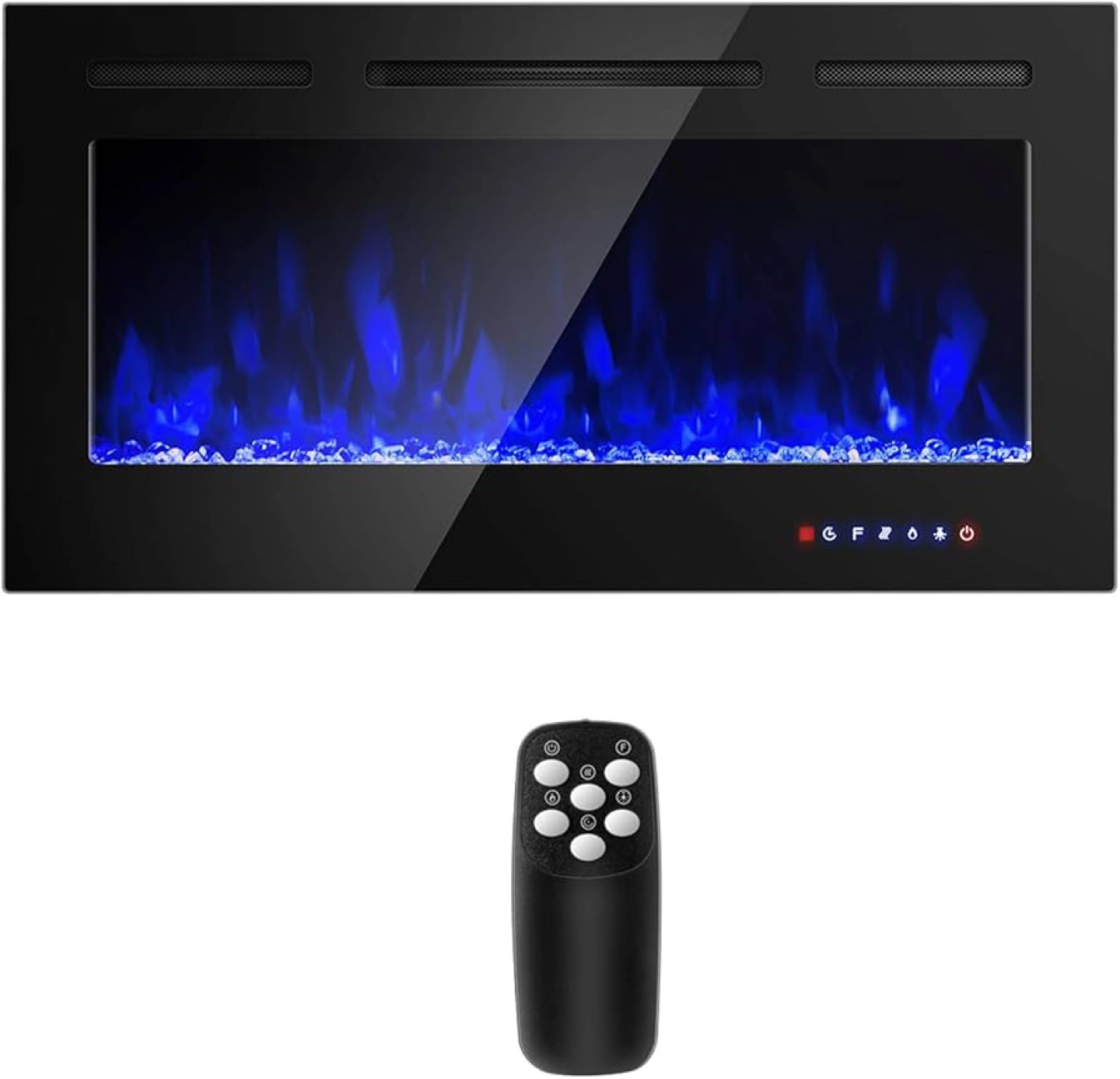 Wall mounted electric fireplace. Features 9 flame colours and 5 brightness settings. Includes remote control. Black finish.