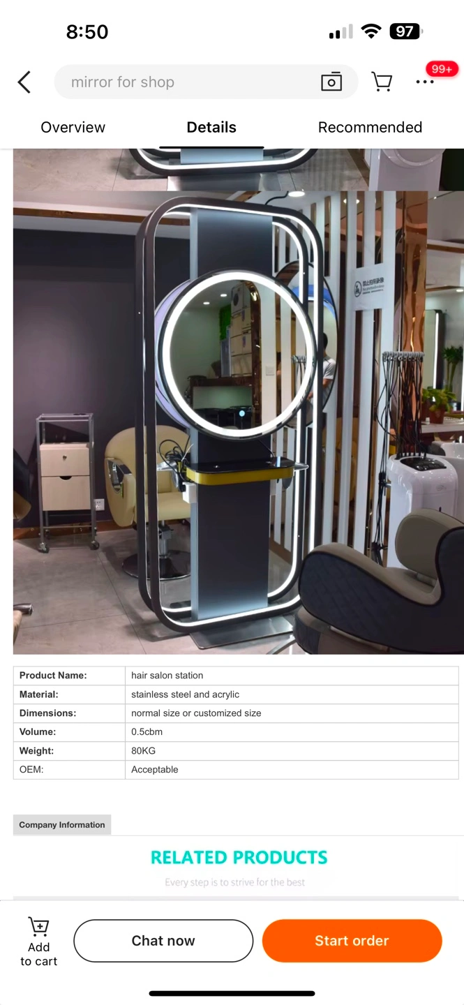 Sleek and stylish hair salon station. Features a large round mirror with LED lights. Stainless steel and acrylic construction. Includes a small shelf for styling tools. Perfect for any modern salon.