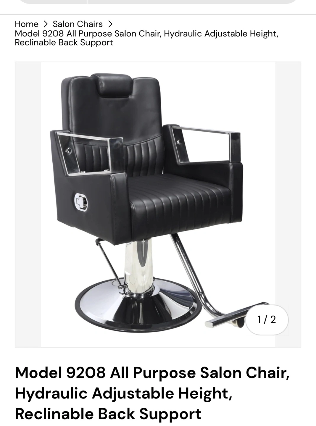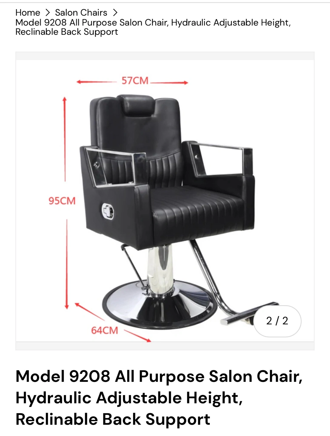 2 Black salon chair, model 9208. Hydraulic adjustable height. Reclinable back support. Chrome base. Measurements provided in images.