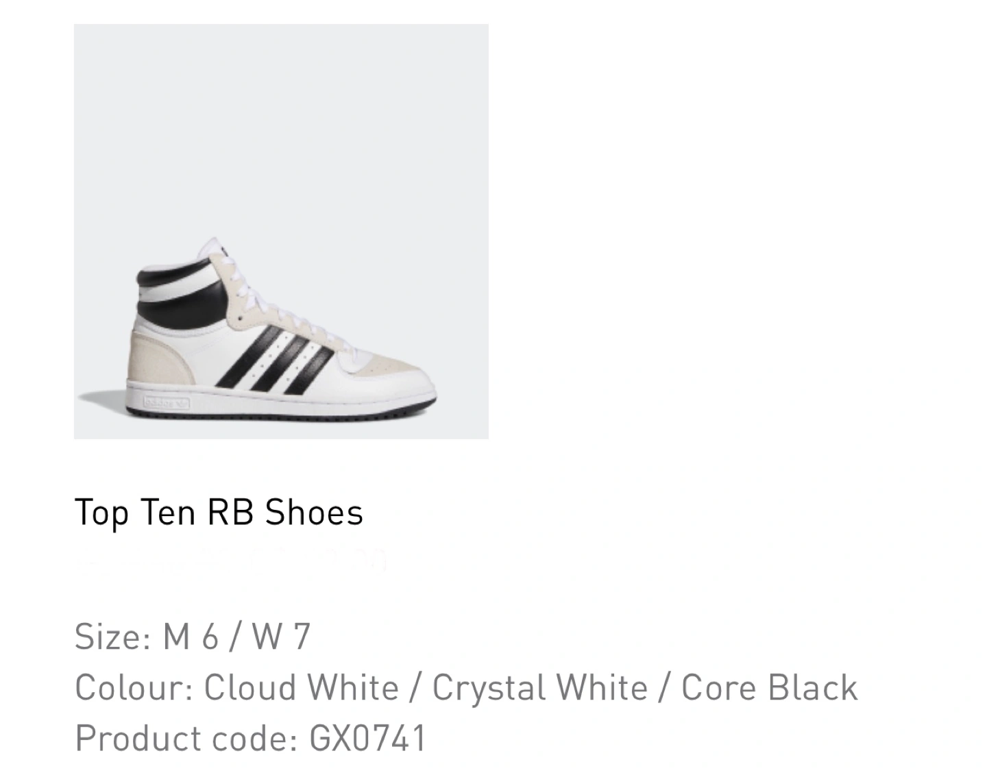 NEW/IN BOX, Adidas Top Ten RB high top sneakers. Size men's 6 / women's 7. Cloud white, crystal white, and core black colourway. Product code: GX0741.