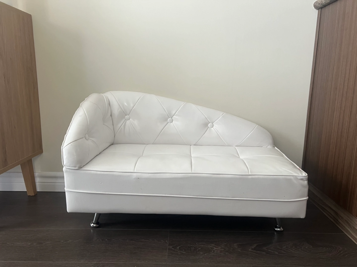 Stylish white pet couch. Modern design, tufted upholstery. Chrome legs. Small size, perfect for kids photo shoots or pets.