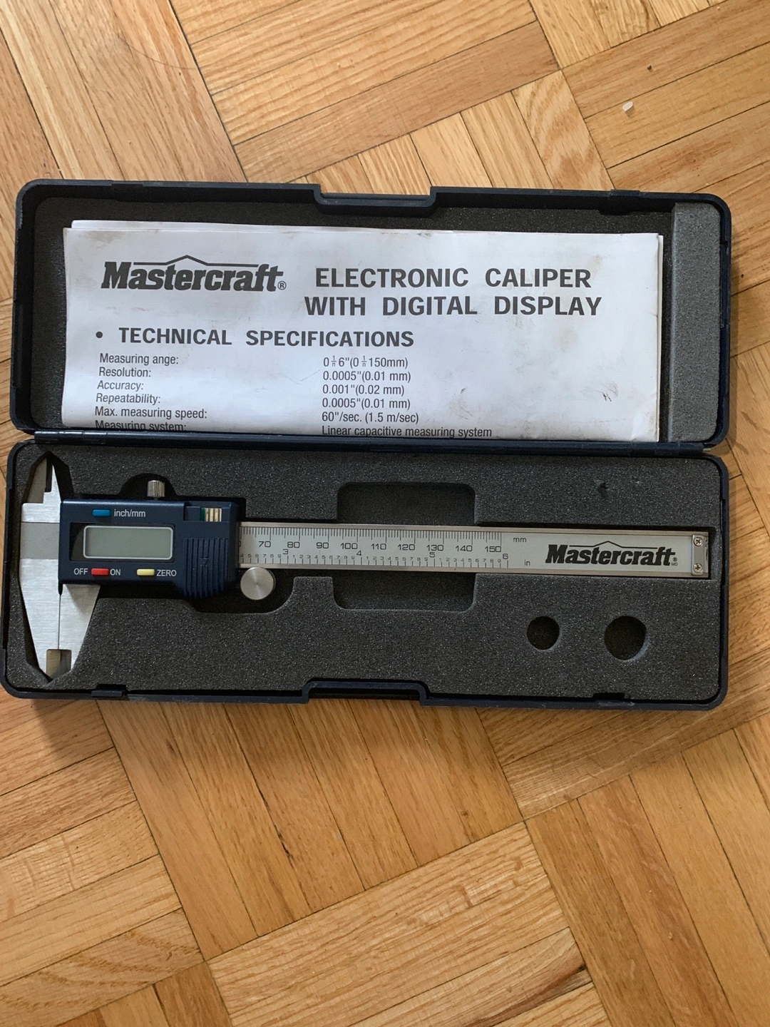 Electronic caliper with digital display. Includes case and instructions. Measures in inches and millimetres.