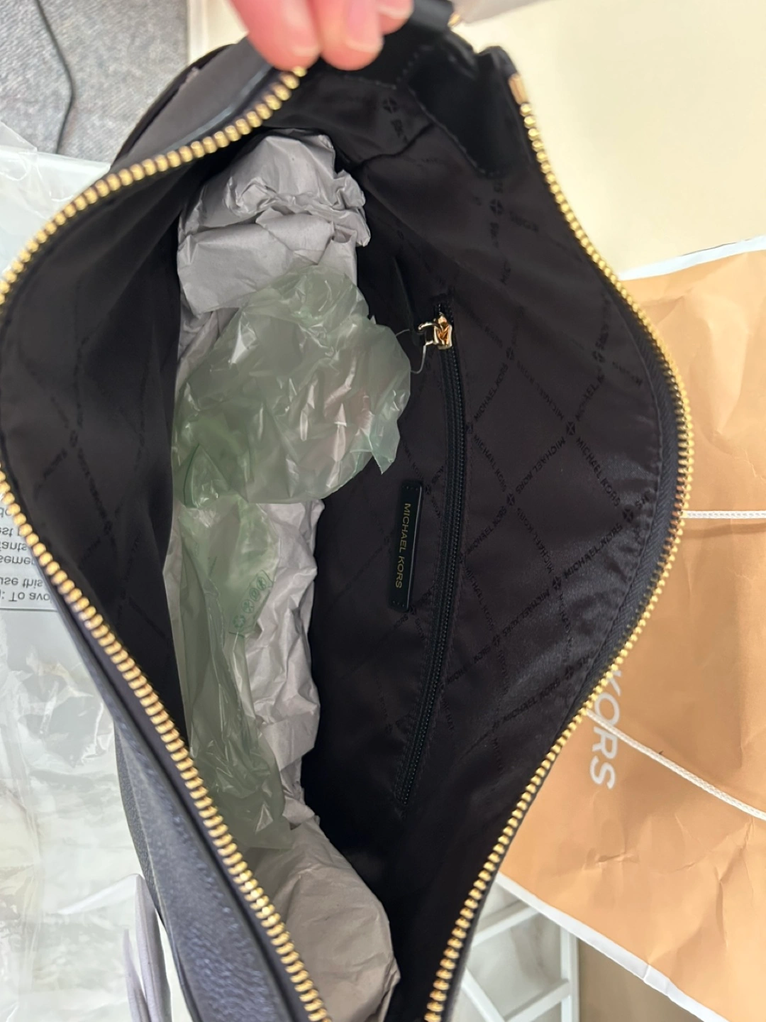 Brand new Michael Kors black leather shoulder bag. Half moon shape. Gold-toned hardware. Interior zip pocket. Comes with tags and dust bag.