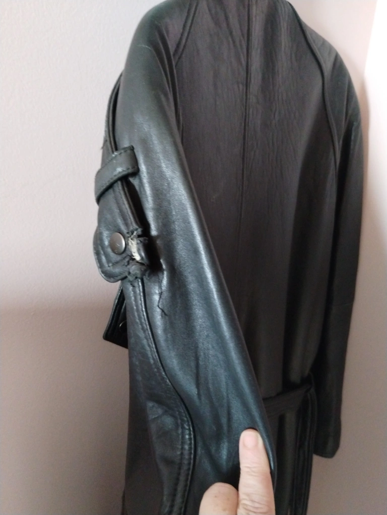 Long black leather trench coat. Features a belt, pockets, and a collared neckline. Shows some wear and tear. Great vintage piece.