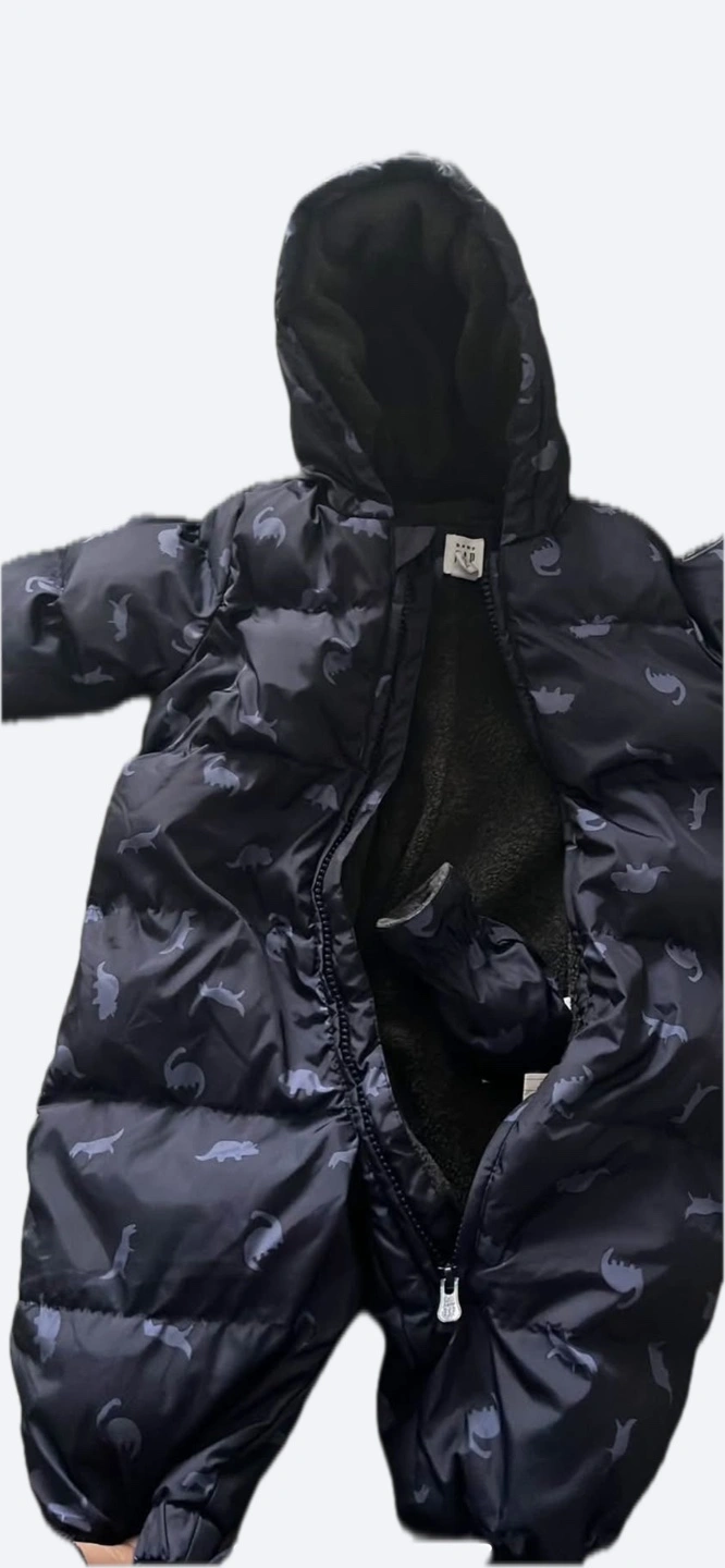 Adorable baby snowsuit. Features a navy blue colour, dinosaur print, and a warm fleece lining. Zipper closure. Perfect for keeping your little one warm during the colder months. Comes with the booties and gloves