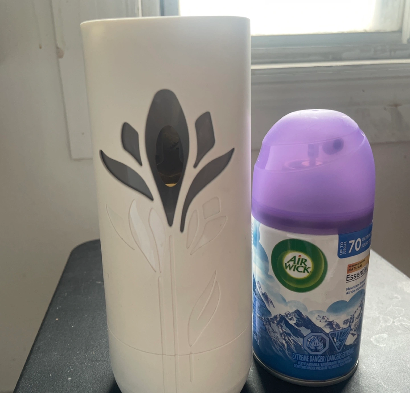Automatic air freshener dispenser with 1 bottle of refill. White dispenser with grey accents. Purple refill bottle. Mountain air scent.