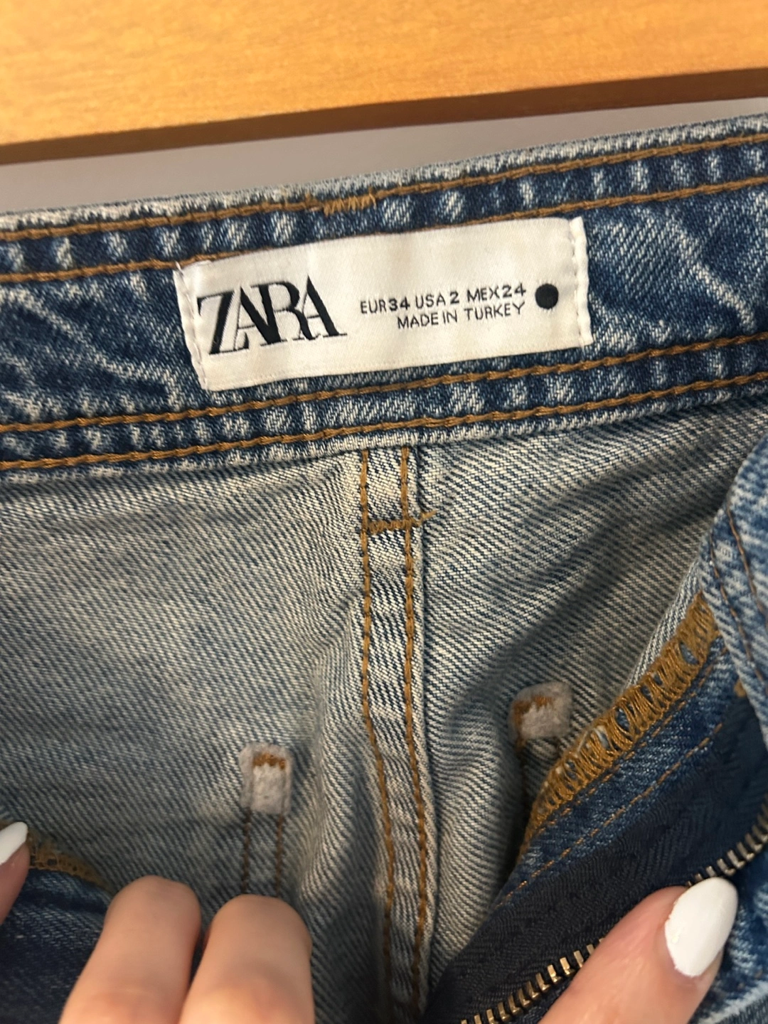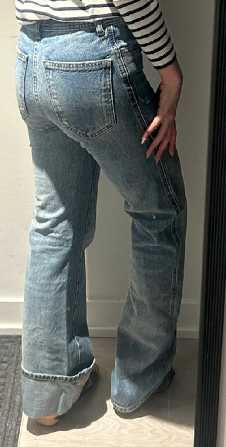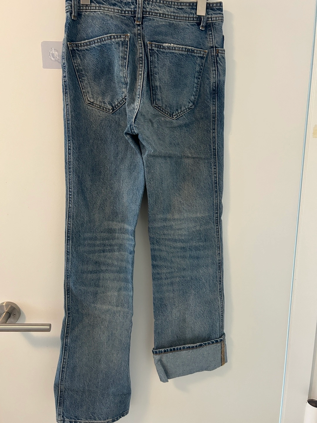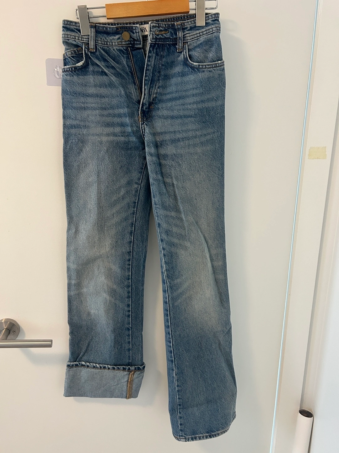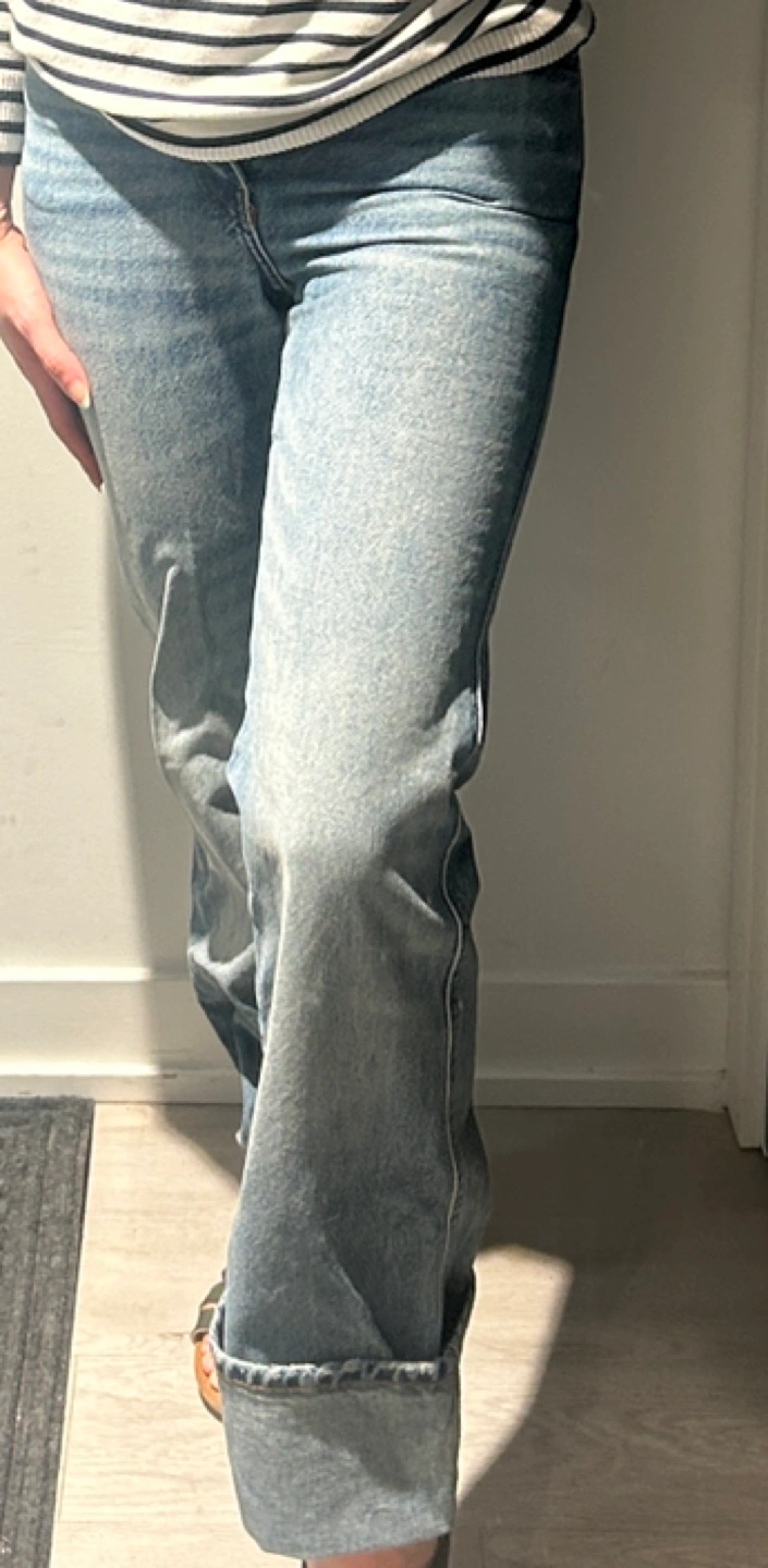Women's light wash straight leg jeans. Size 2. Made in Turkey. Slight distressing. Cuffed hems.