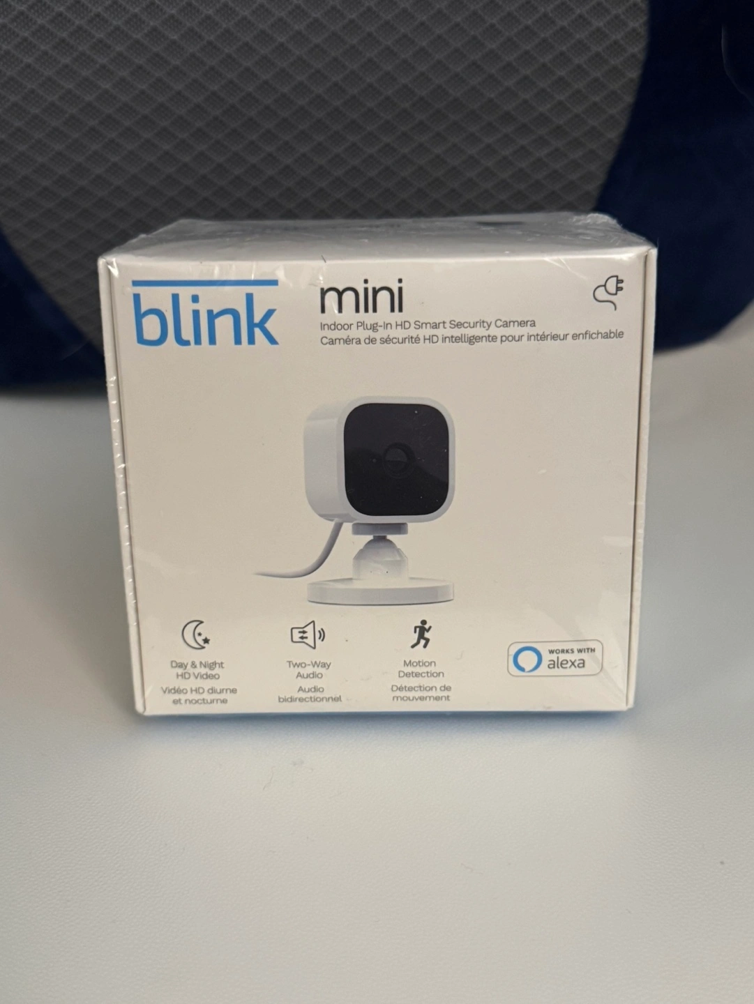 New Blink Mini indoor smart security camera. Plug-in HD camera. Features day and night HD video, two-way audio, and motion detection. Works with Alexa.
