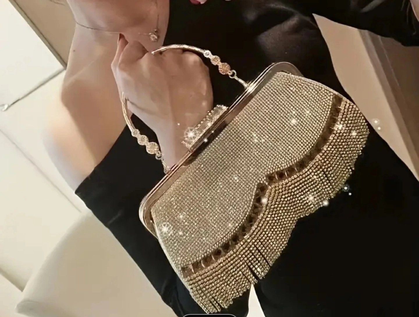 Gorgeous gold rhinestone clutch. Features a unique tassel design. Perfect for special occasions. Includes a top handle.