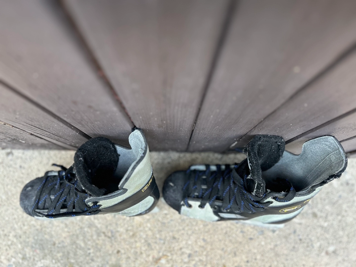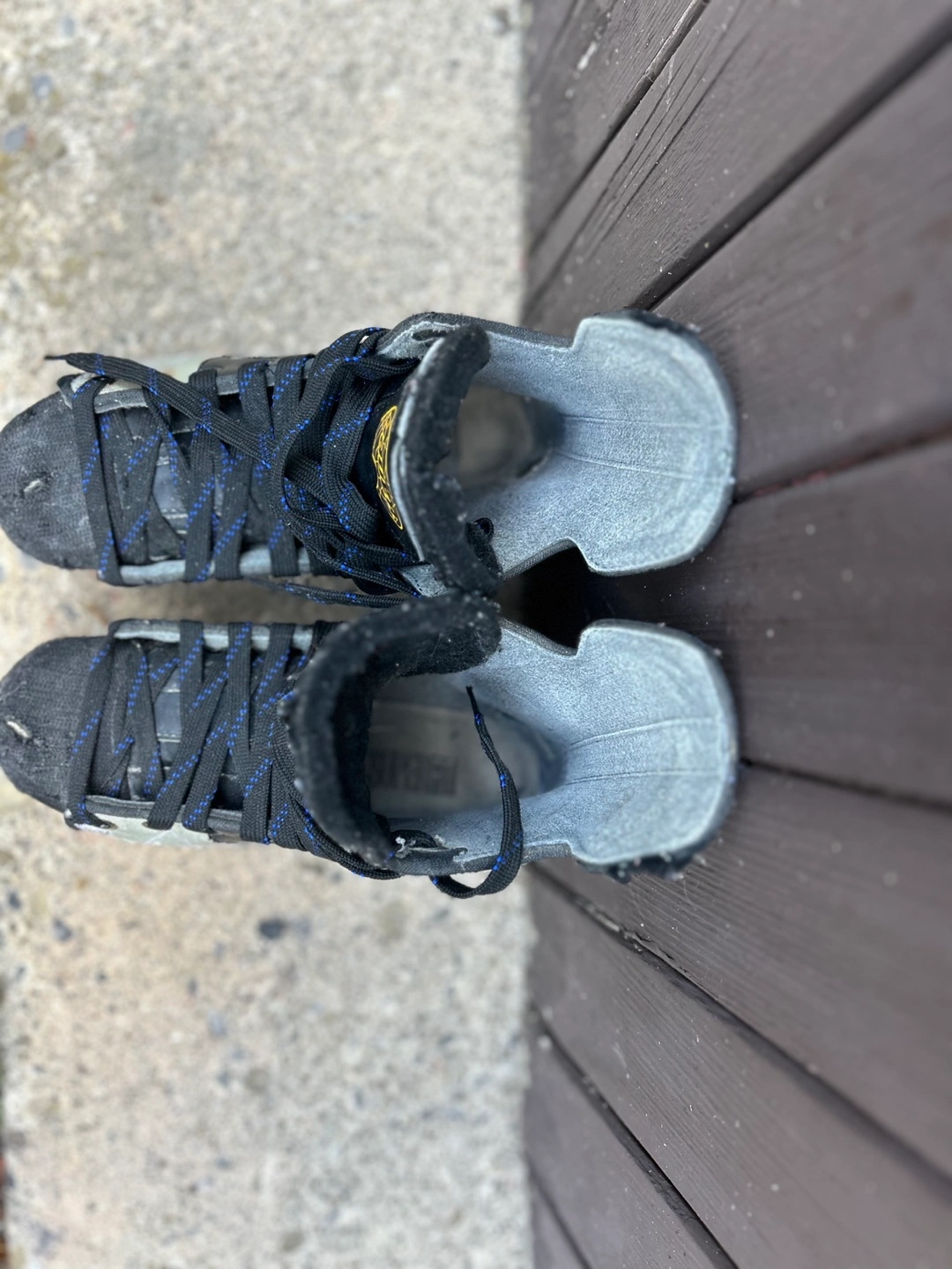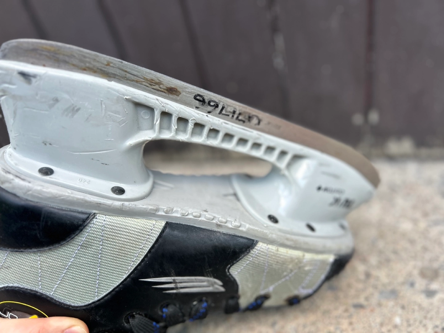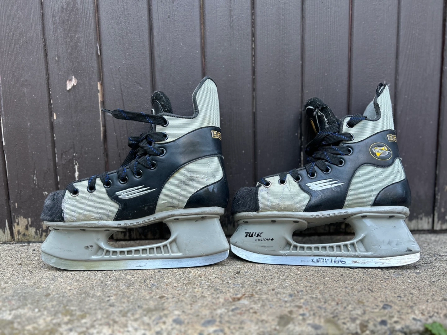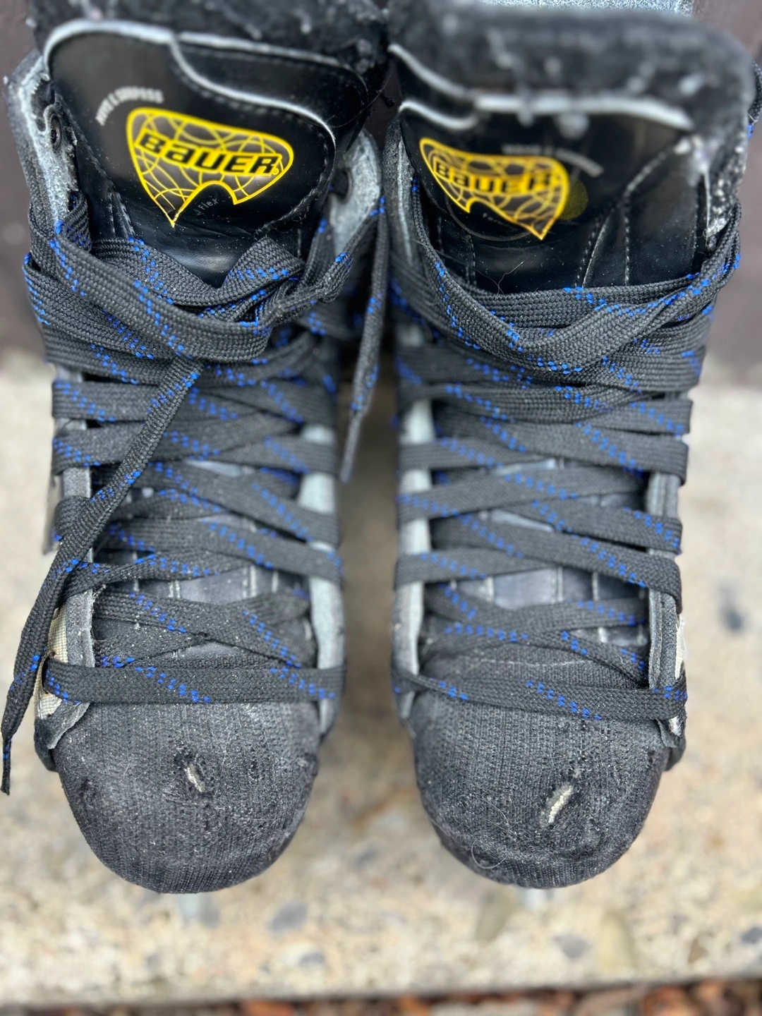 Used Bauer ice skates. Grey and black colour scheme. Side 5.5. Black laces with blue accents. Vapor V. Show some wear.