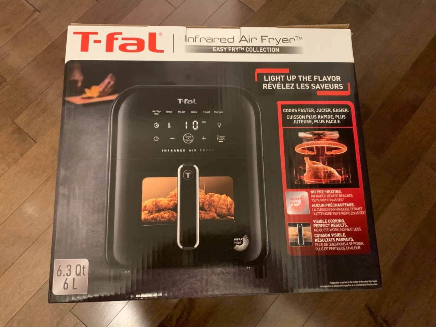 Brand new, unopened T-fal infrared air fryer. 6.3 qt capacity. Easy Fry™ collection. Cooks faster, easier, juicier. Features infrared heating and visible cooking.