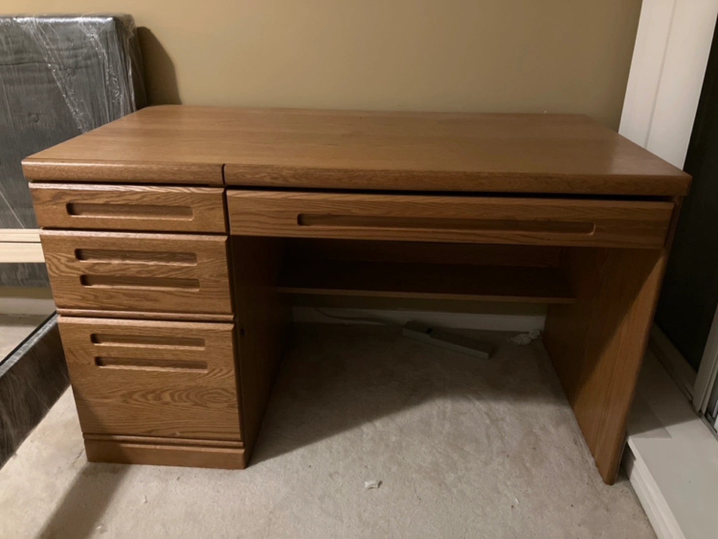 Solid wood desk with 4 drawers. Cannot be disassembled. *Heavy* In good condition. All the drawers are smooth and functional.
