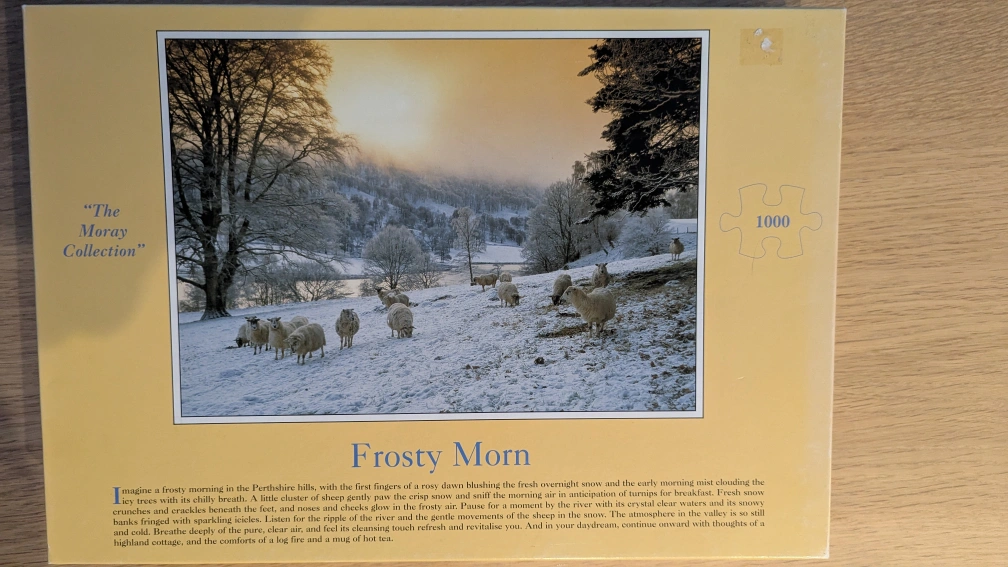 1000-piece jigsaw puzzle. Snowy winter scene featuring sheep. Part of The Moray Collection.