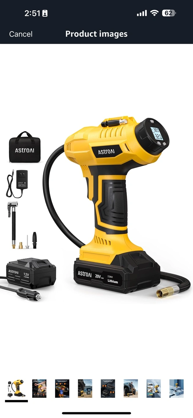 Powerful cordless air compressor. Inflates car, motorcycle, and bike tires. Includes two batteries, charger, and accessories. Long lifespan.
