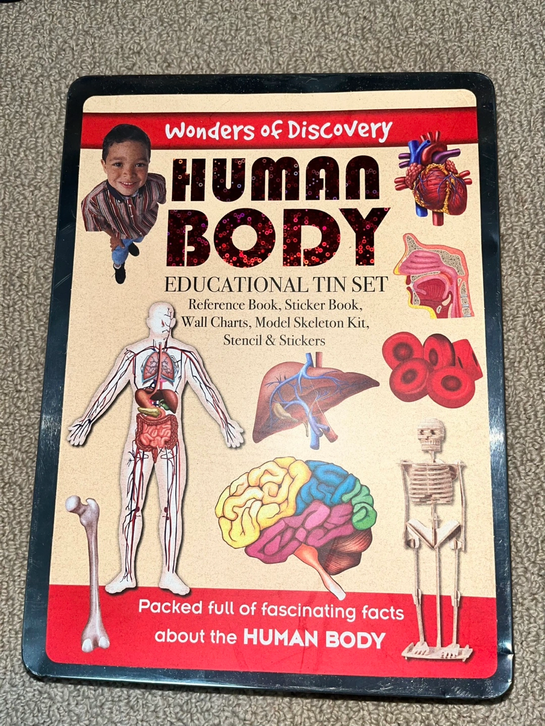 Educational tin set includes wooden model skeleton pieces, reference book, sticker book, wall charts, stencils and stickers. Great for learning about anatomy. Asking $10