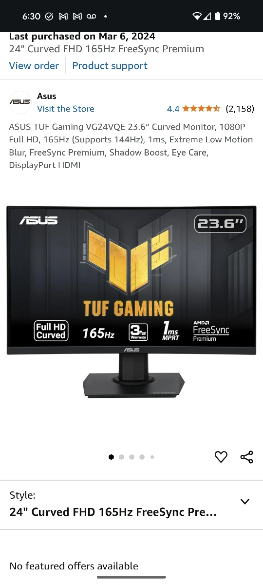 ASUS TUF Gaming VG24VQE 24" Curved FHD 165Hz Monitor