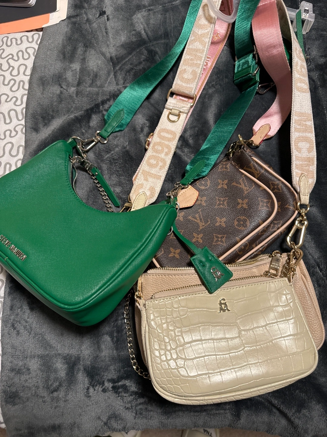 Three pre-owned crossbody bags. Green Steve Madden bag, Louis Vuitton, and beige crocodile-embossed bag. Bags in good condition, some minor wear. Sold separately or as a bundle. Check images for details.