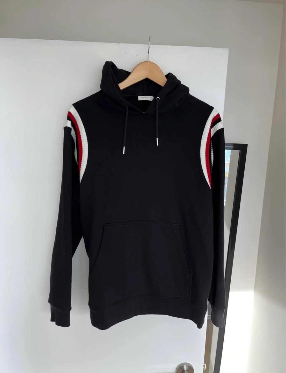 Worn twice, Black thick Hoodie with Red/White trim, Size medium
