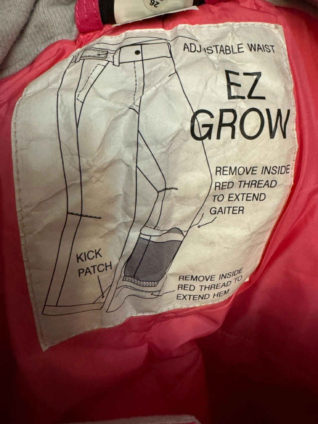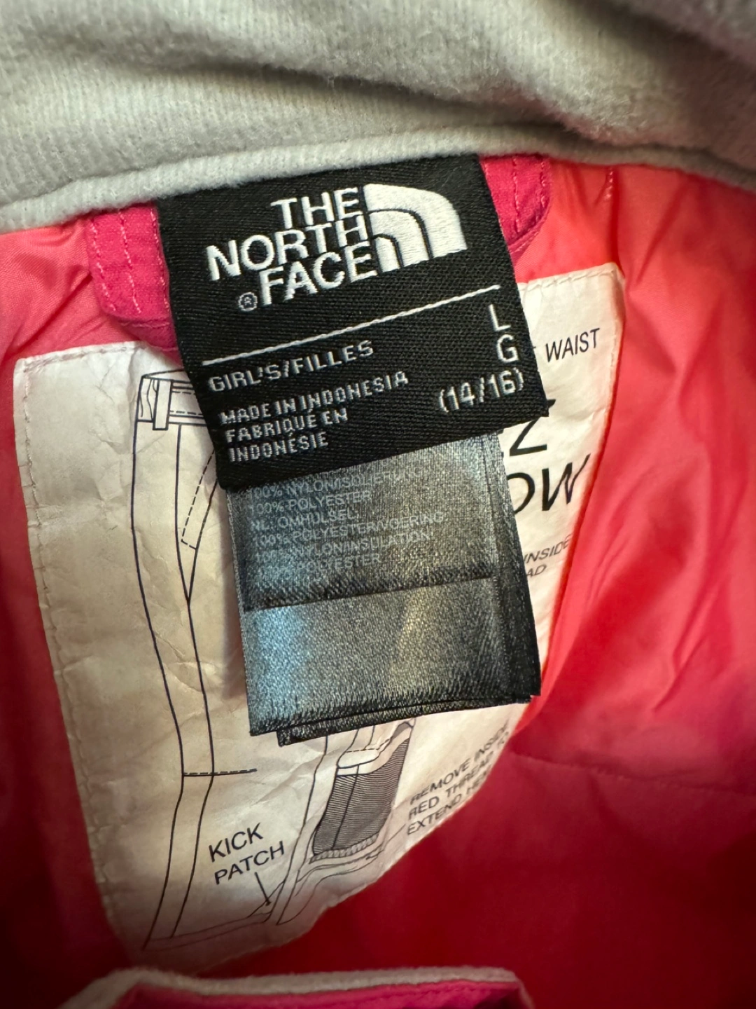 103Girls' The North Face snow pants. Pink colour. Size large (14/16). Features adjustable waist and EZ Grow system. DryVent technology. Excellent for skiing or snowboarding.