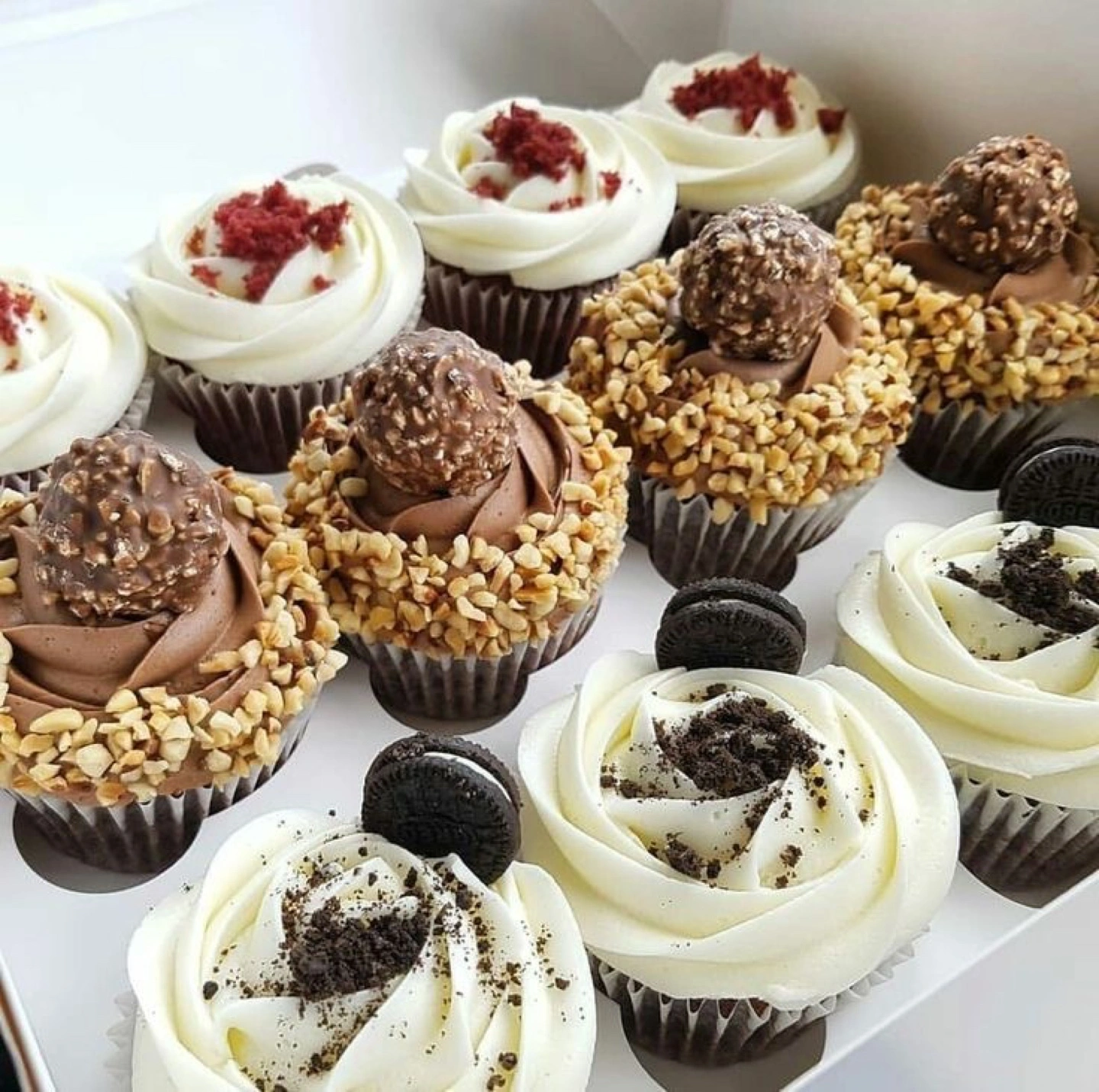 Assorted flavour cupcakes: red velvet cupcake with cream cheese icing and cake crumbs on top, chocolate cupcake with chocolate icing, hazelnut and Ferrero Rocher on top & chocolate cupcake with cream cheese icing, Oreo and Oreo crumbs. 12 pcs/4 of each. MADE FRESH