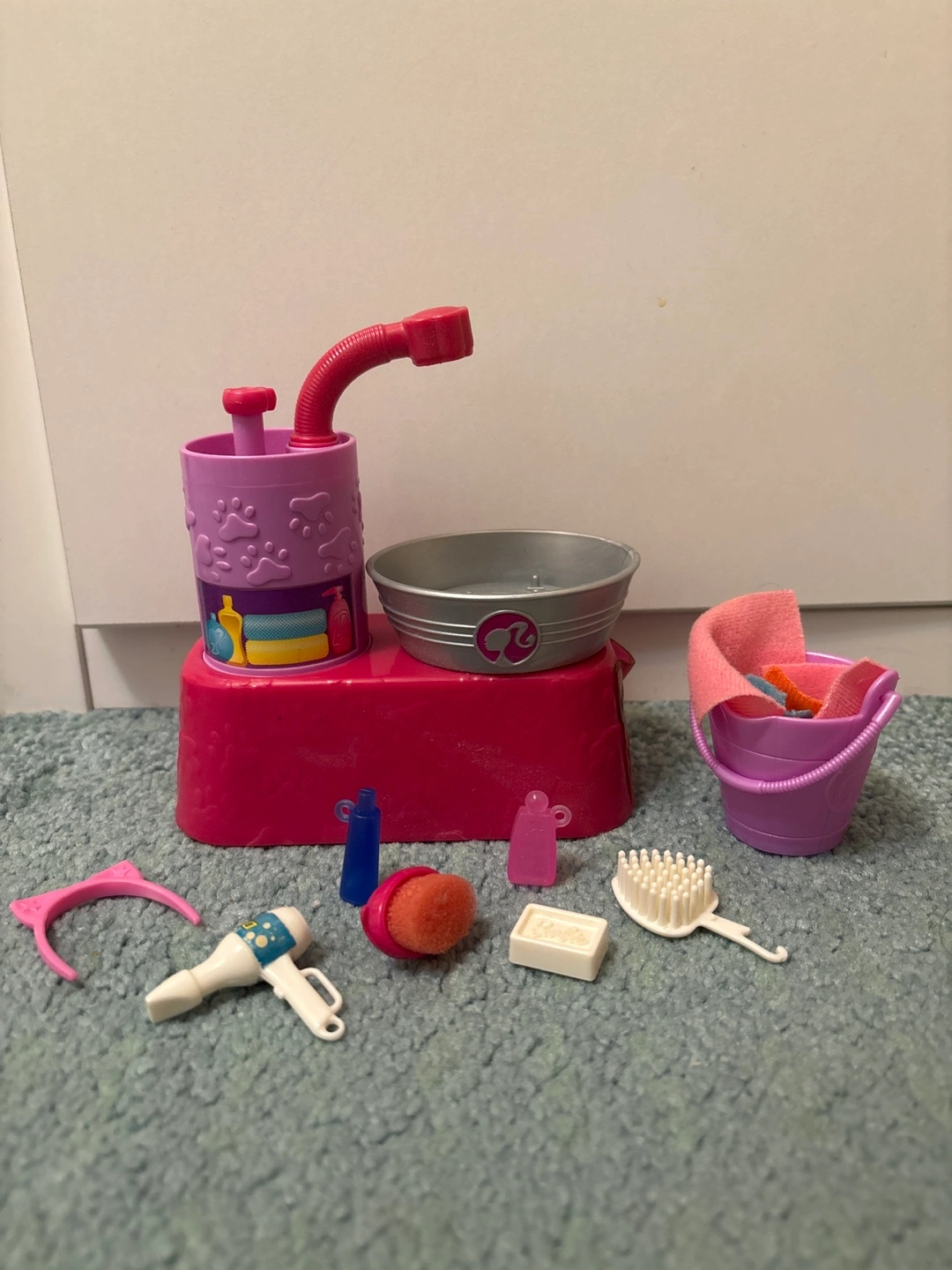 192Adorable Barbie pet grooming station. Includes a wash station, bowl, bucket, hairdryer, brush, headband, and various grooming accessories. Perfect for imaginative play.