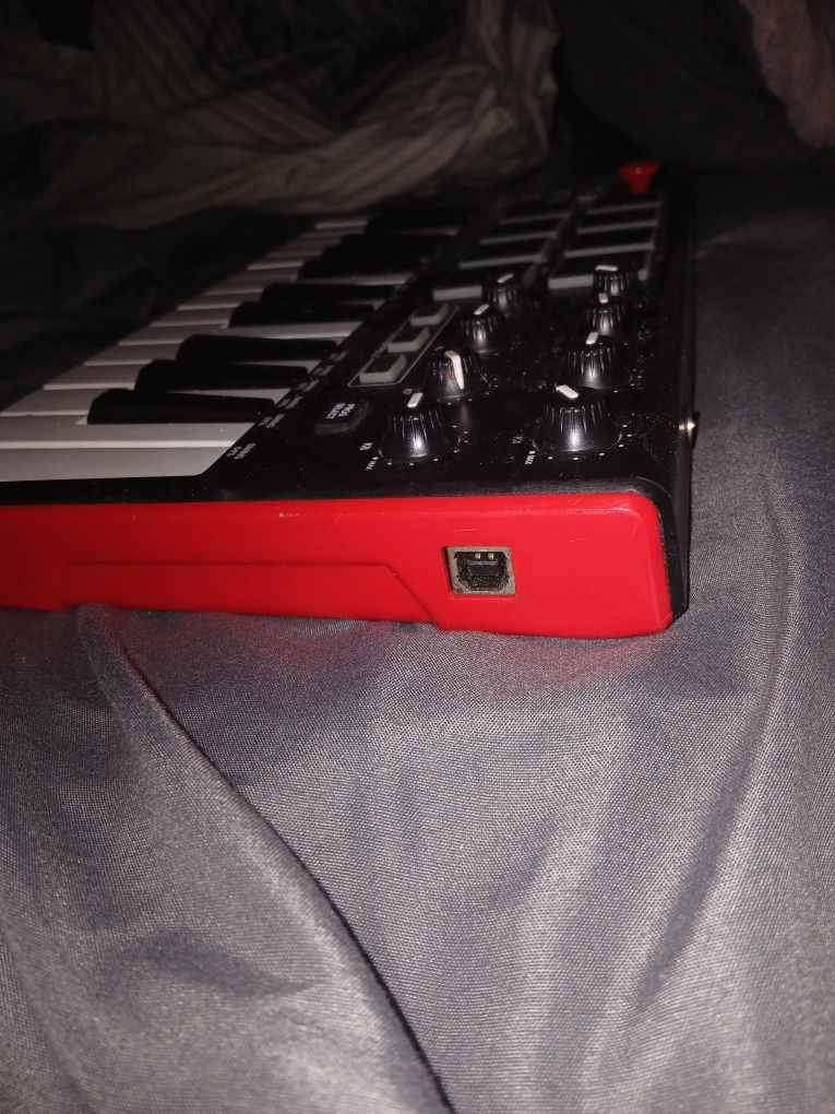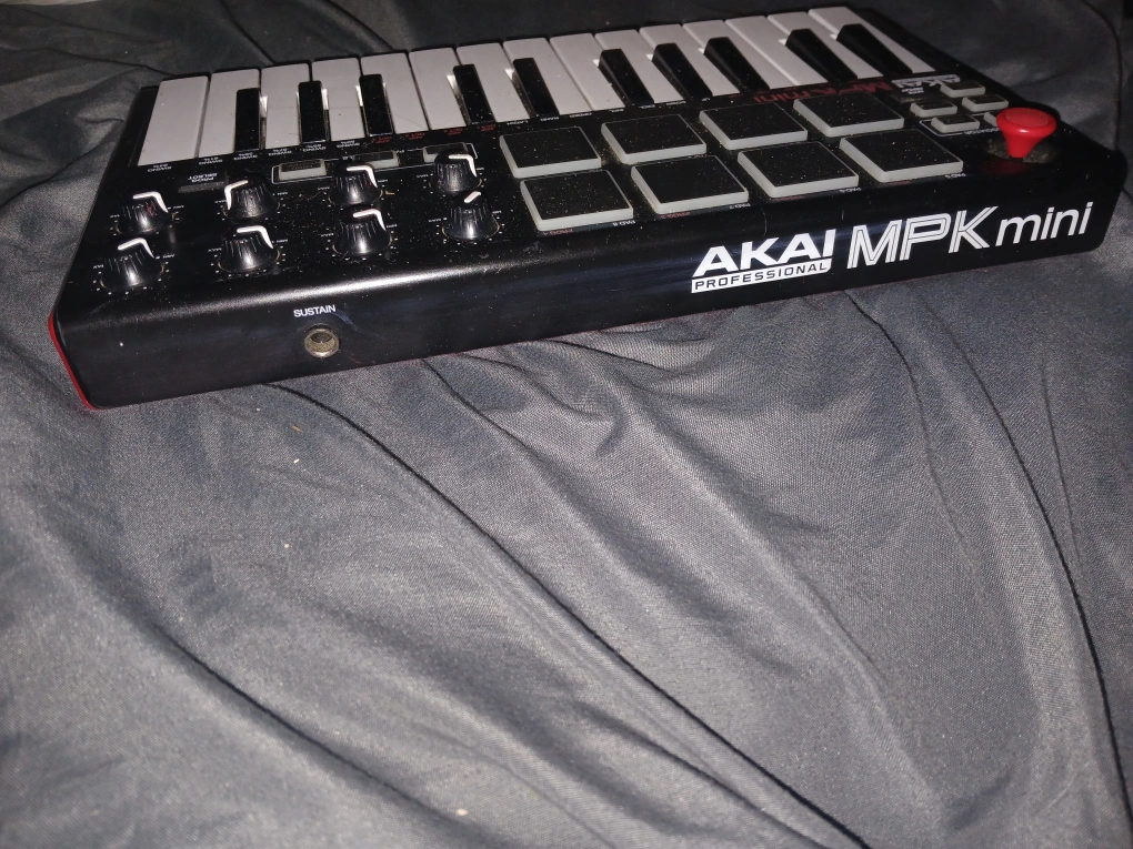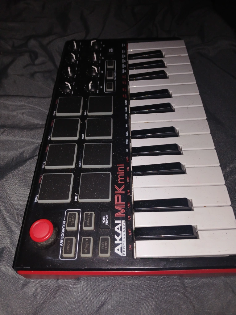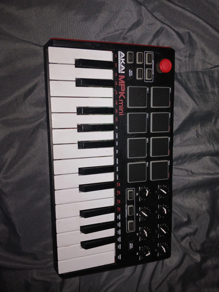 Compact MIDI keyboard controller. Features 25 mini keys, 8 drum pads, knobs, and buttons. USB powered. Good for music production and performance.