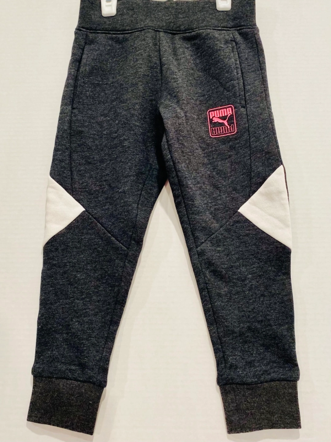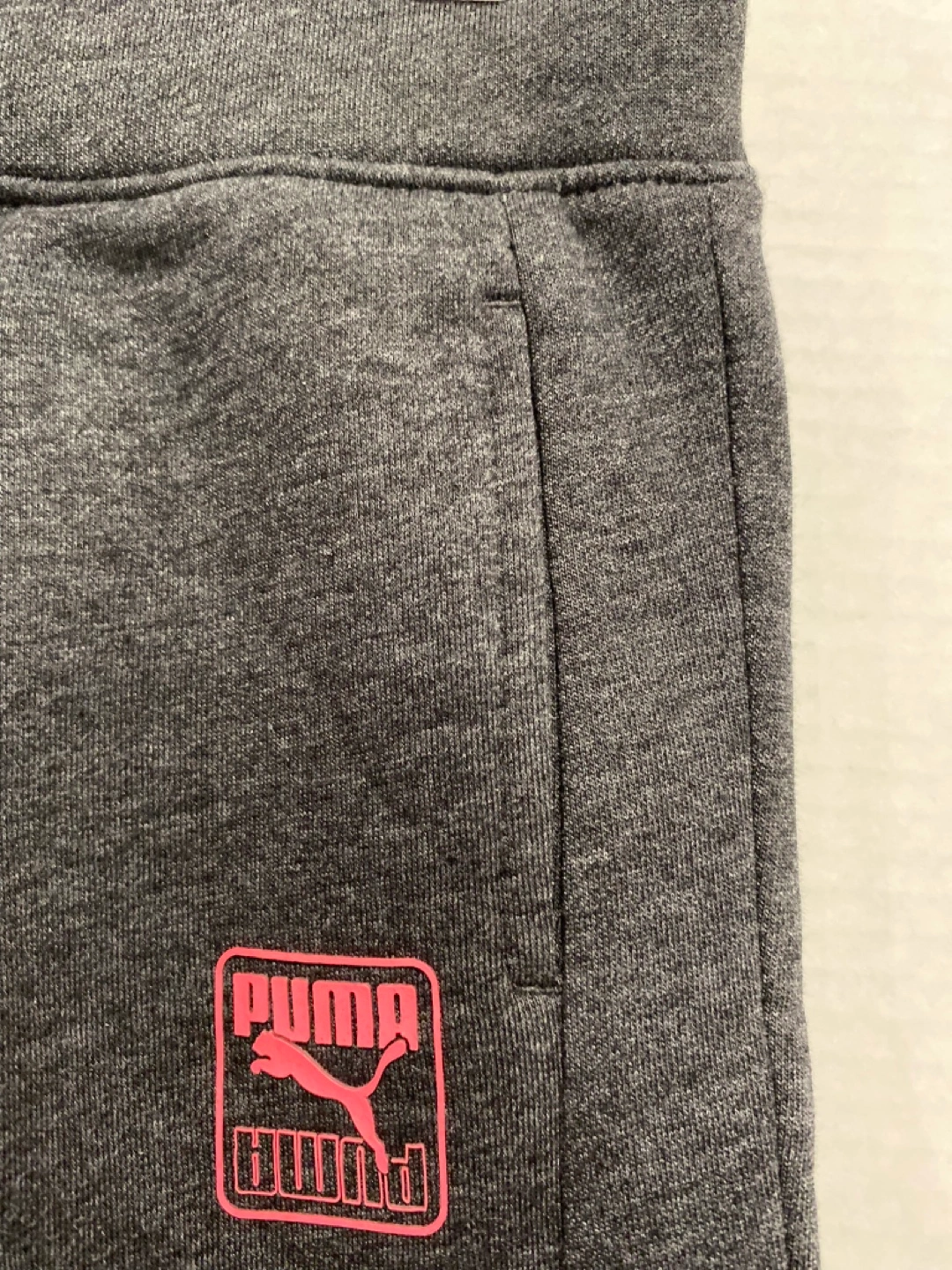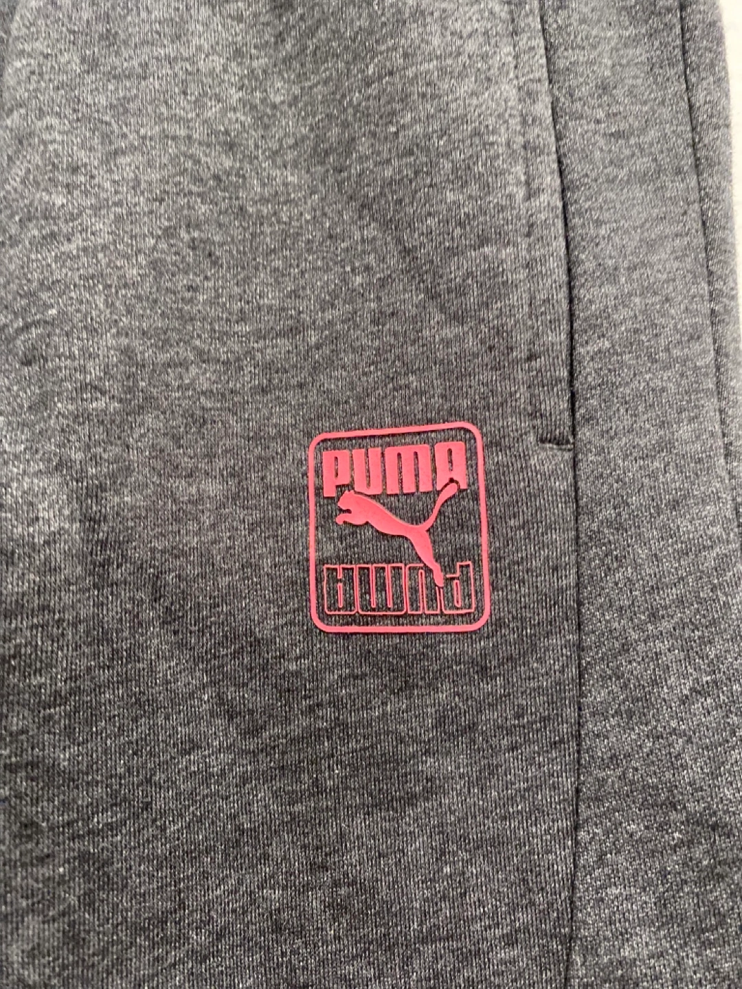 Gray sweatpants wind pants with white accents. Features a Puma logo. Cuffed ankles. New. No tags.