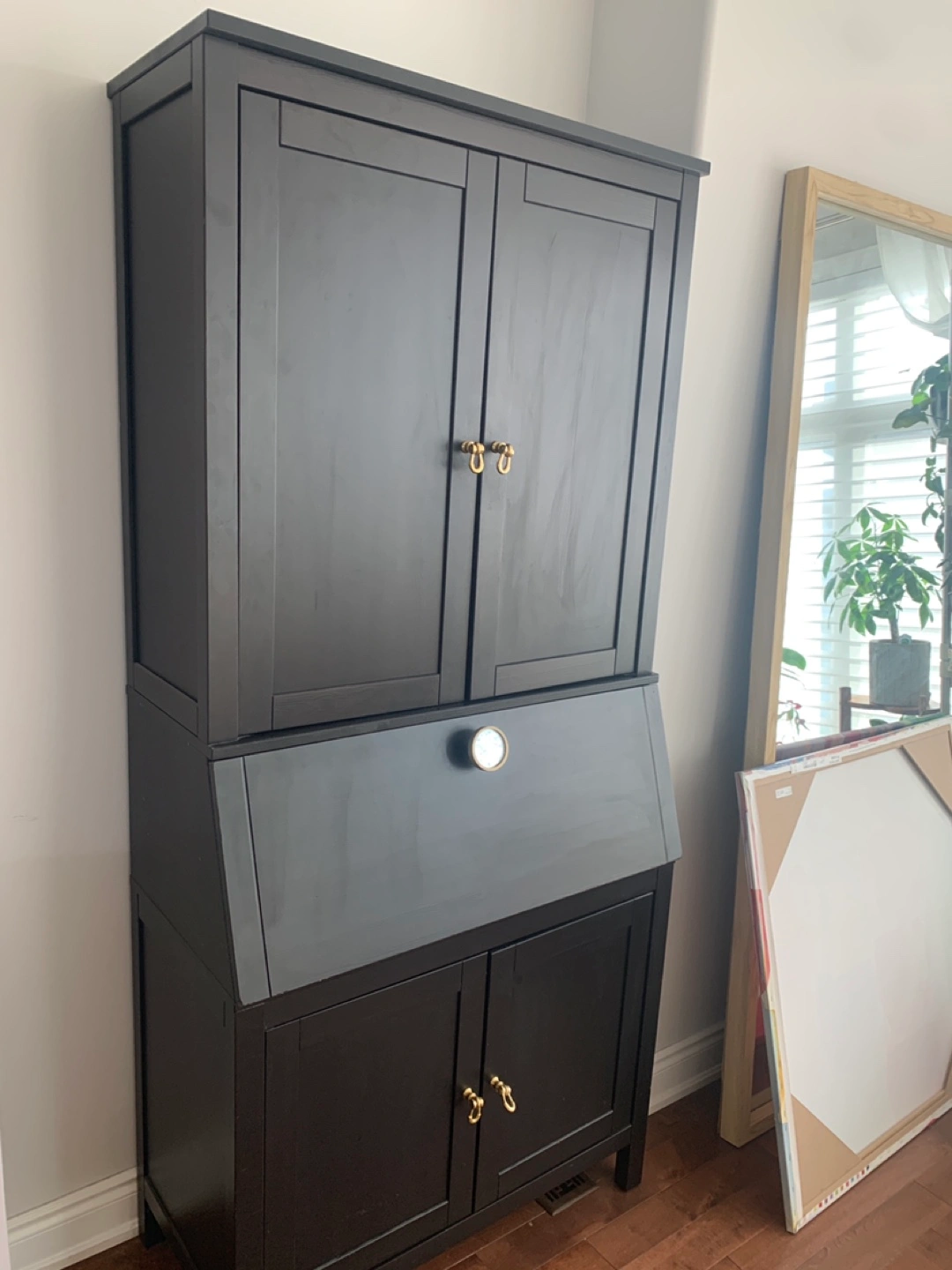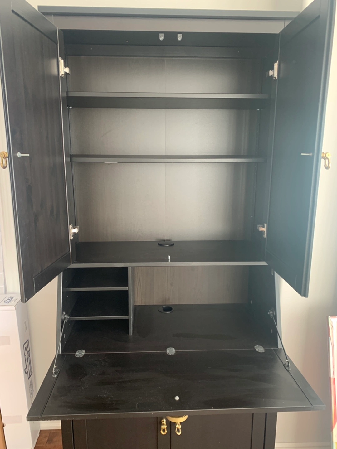 Dusty but in excellent shape - we mostly used it as a bar cabinet. Also great as a hidden work desk in a kitchen/living room area.