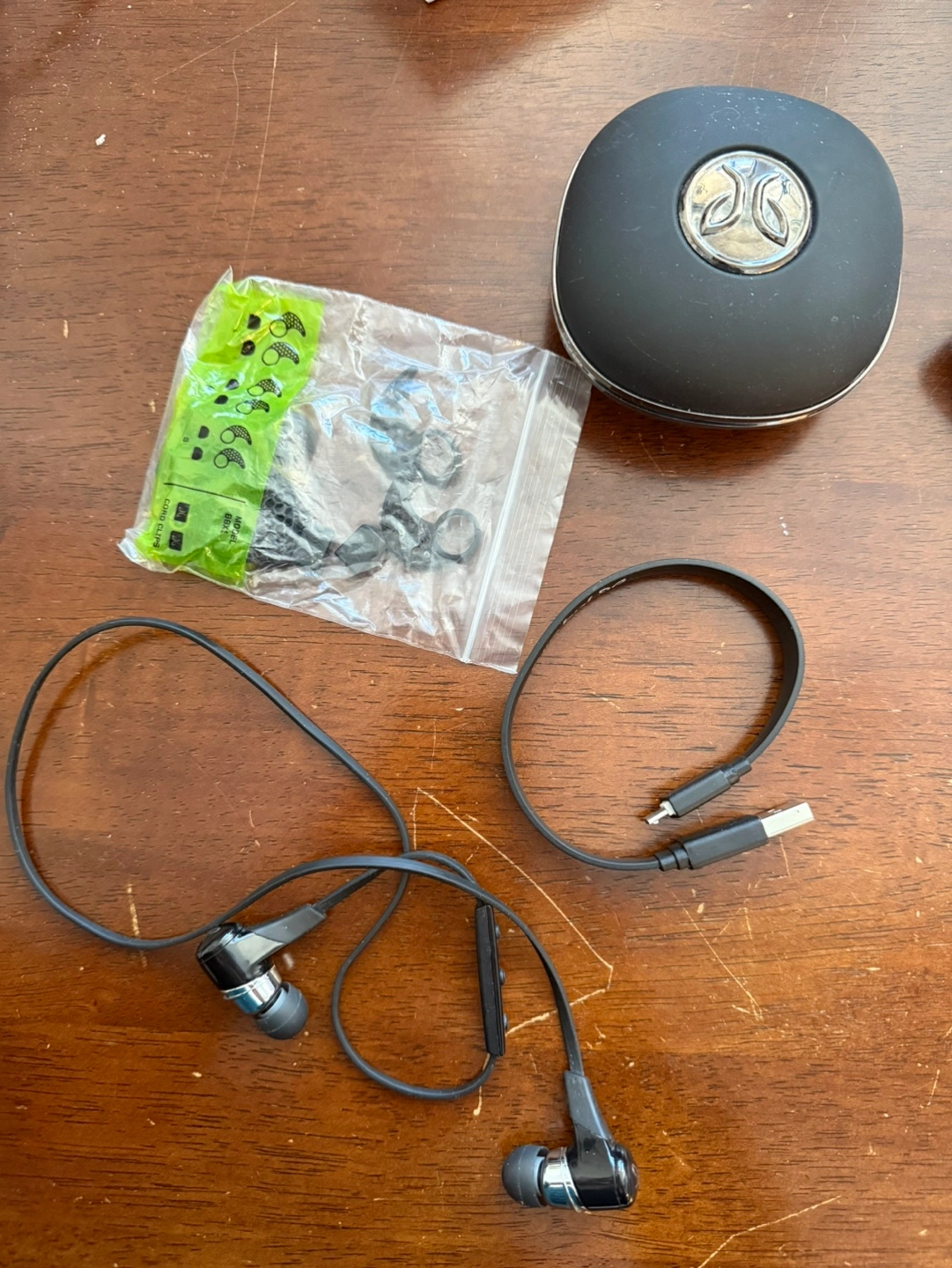 Jaybird sport bluetooth wireless headphones. The charging dock is in one of the earbuds, comes with all the accessories. google "jaybird bbx1mb bluetooth sport stereo headphones" on amazon to see the exact pair for $135.