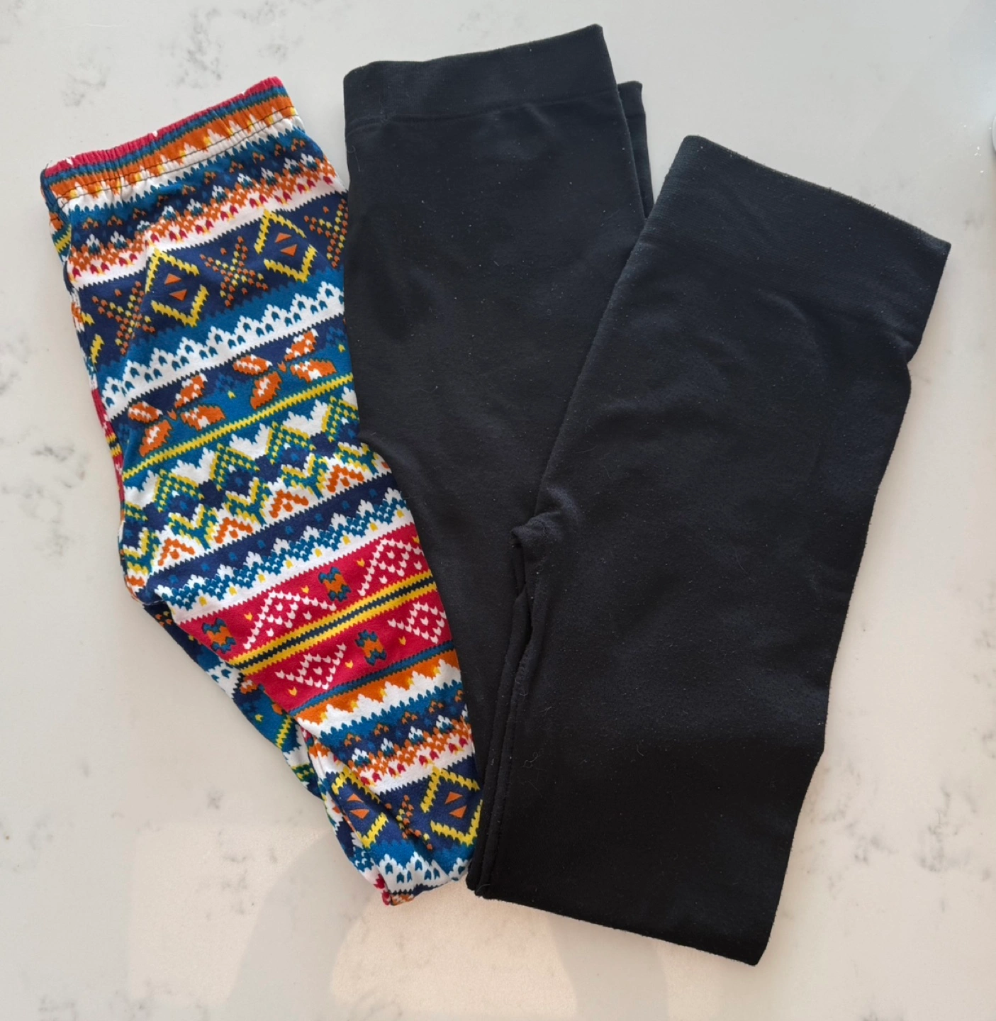 Three pairs of leggings, two black and one patterned. Great for layering or lounging around the house. Soft and stretchy material.