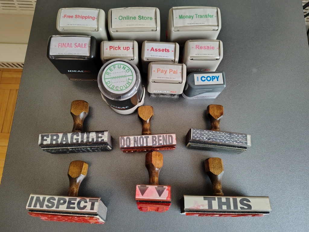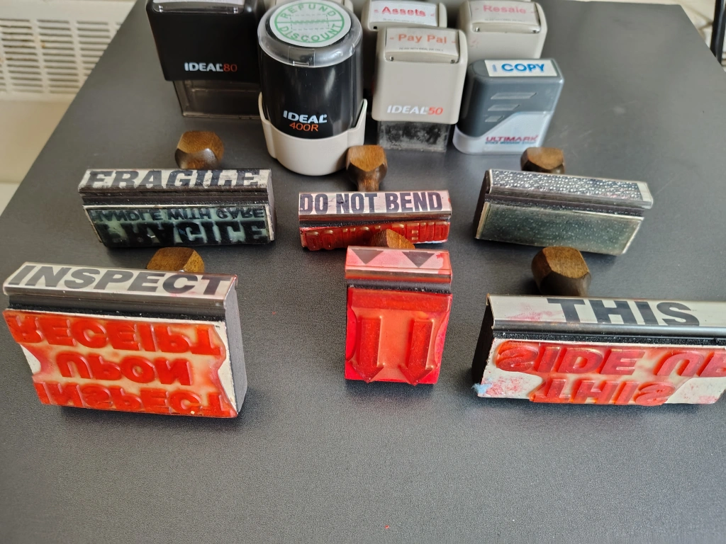 Self inking Commerical / Business stamps. Most are Ideal 100, Ideal 80 and ideal 50 stamps. You can add few drops of ink and they are good to go. In total 16 stamps - sold in bulk. I priced them very low.