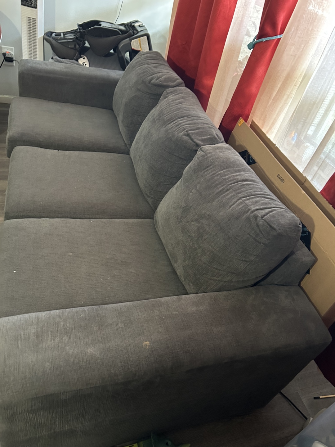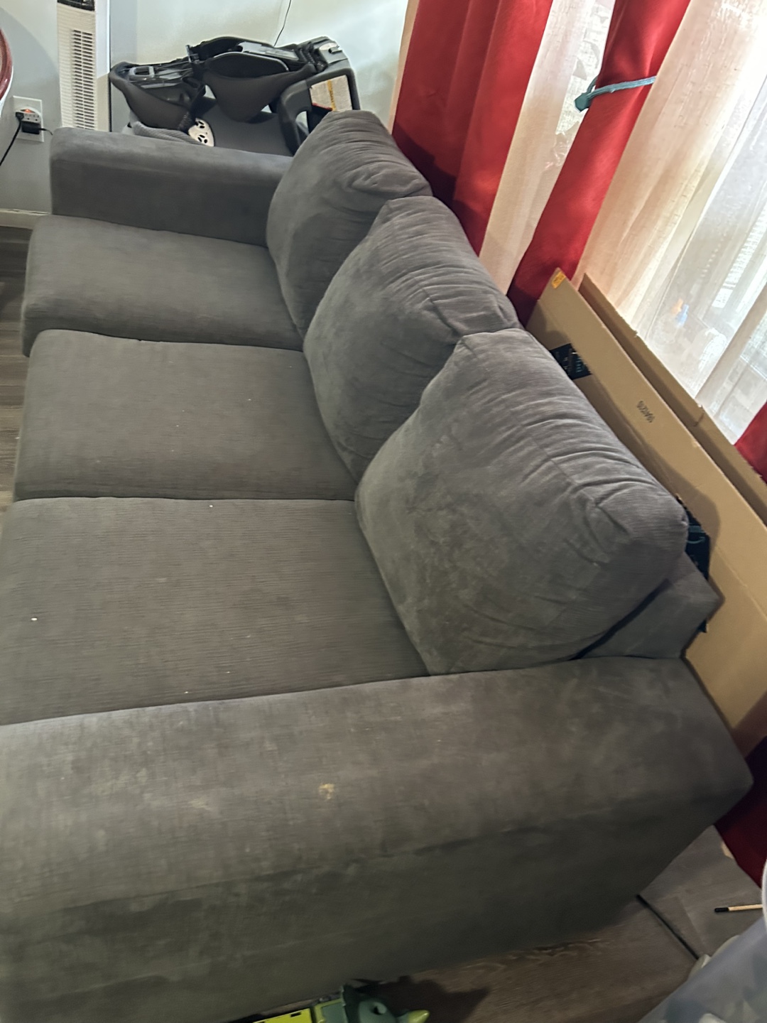 Dark grey fabric sectional sofa. Three seat cushions. Two back cushions