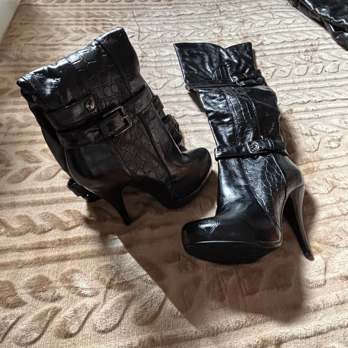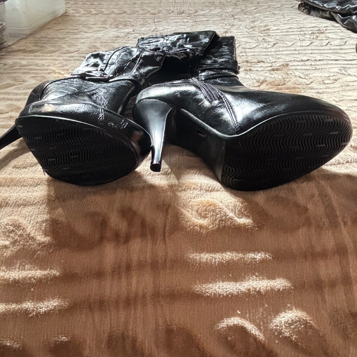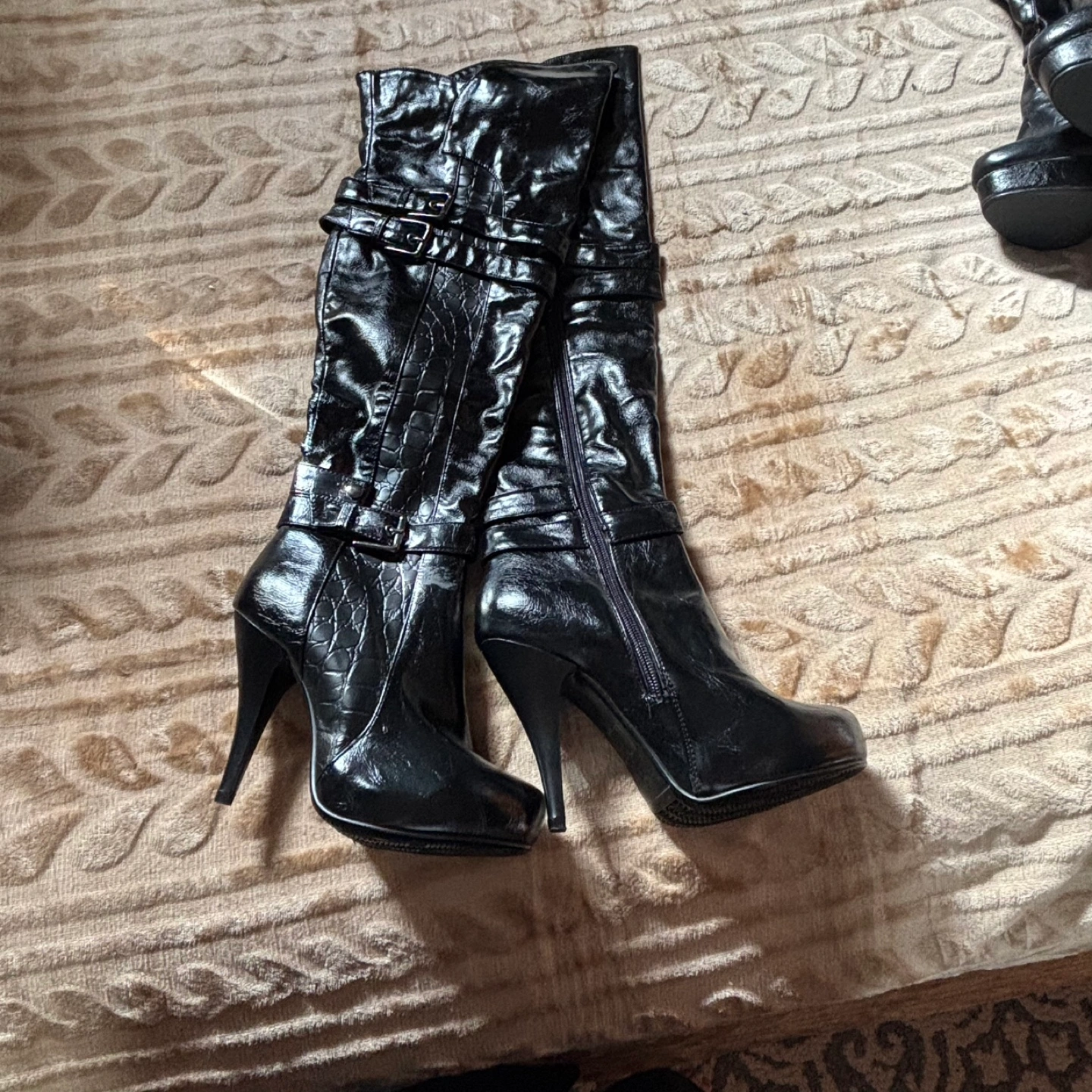 Elegant black leather knee-high boots. Features stiletto heels and buckle accents. Crocodile-embossed detail on the shaft. Side zipper closure for easy on and off.