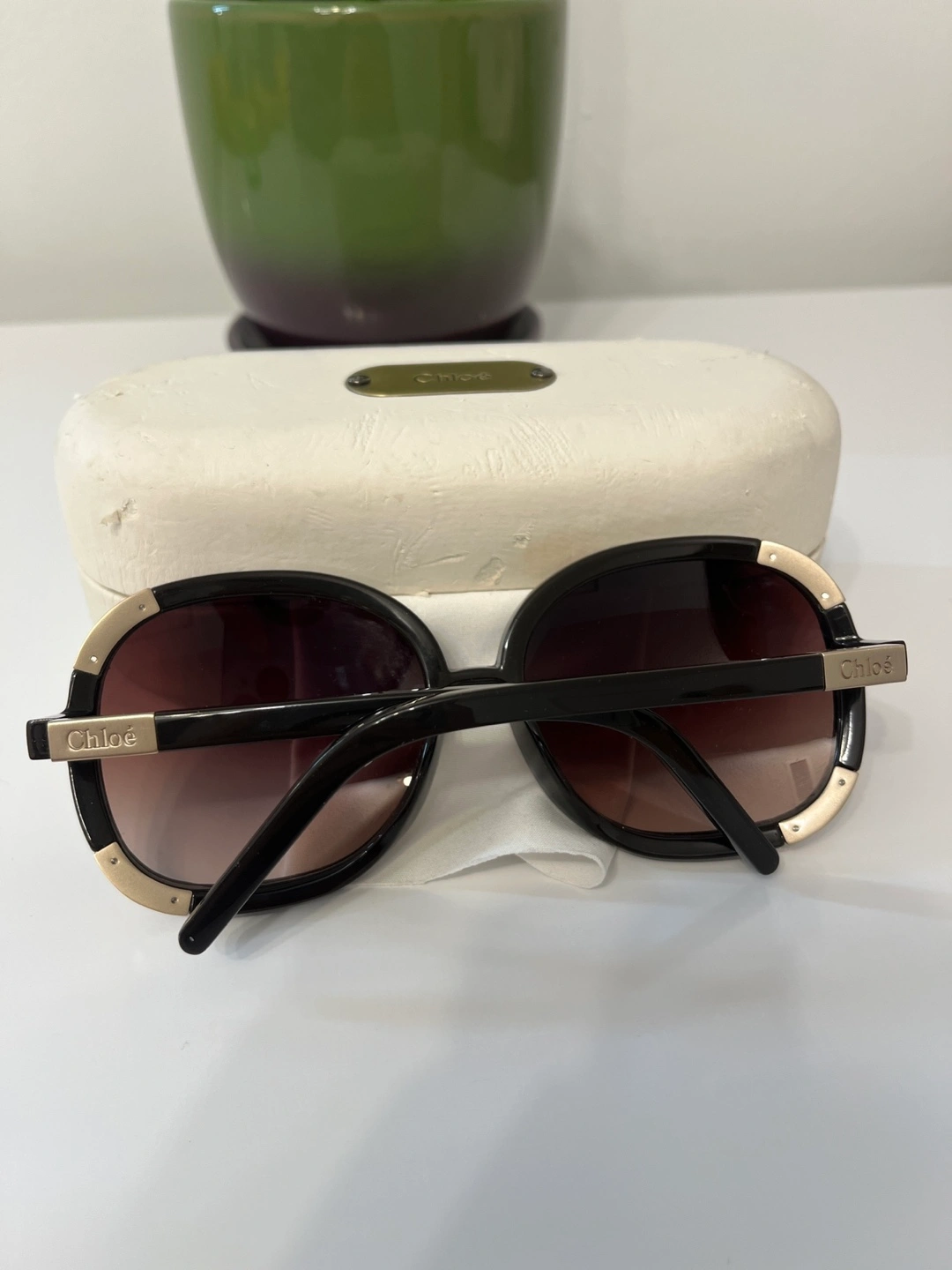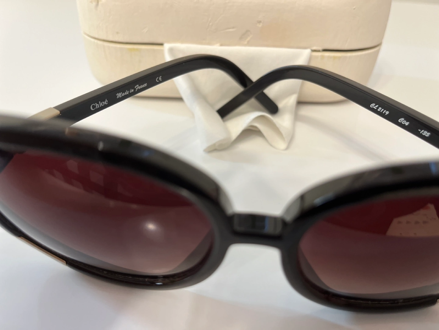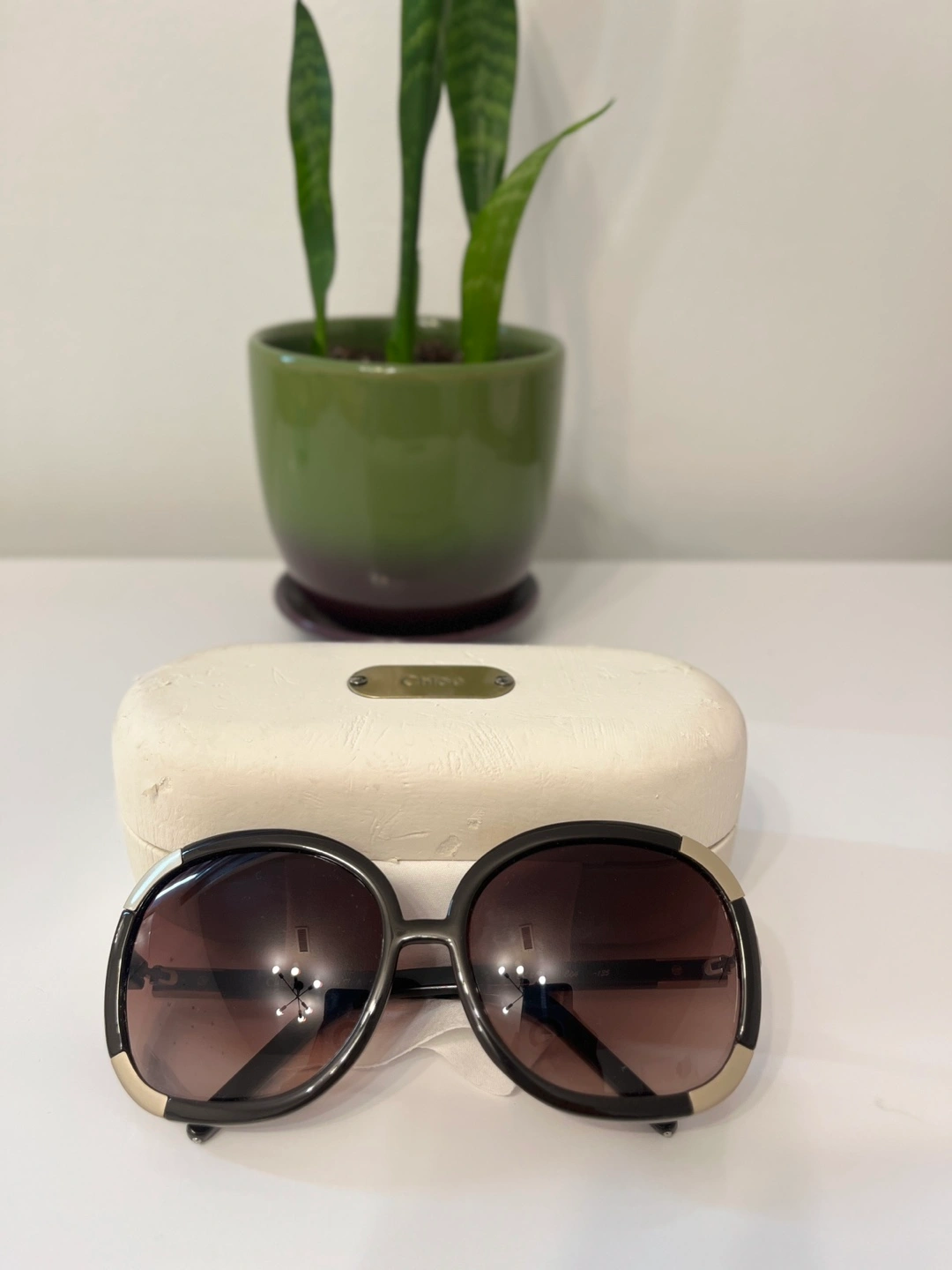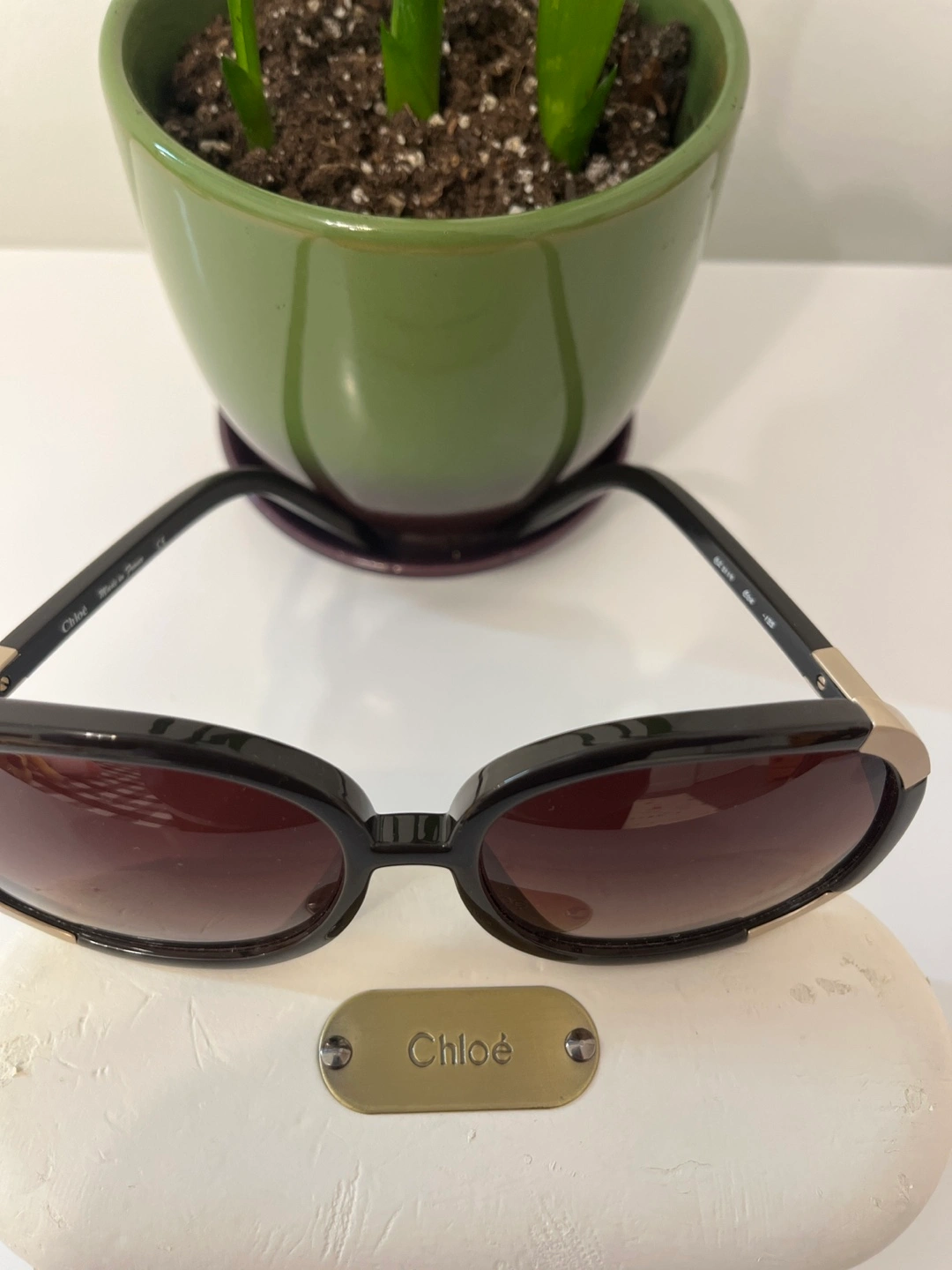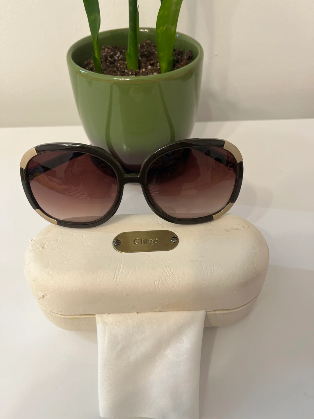 Women's Chloé sunglasses. Brown gradient lenses. Gold accents. Comes with case and cleaning cloth. Made in France.