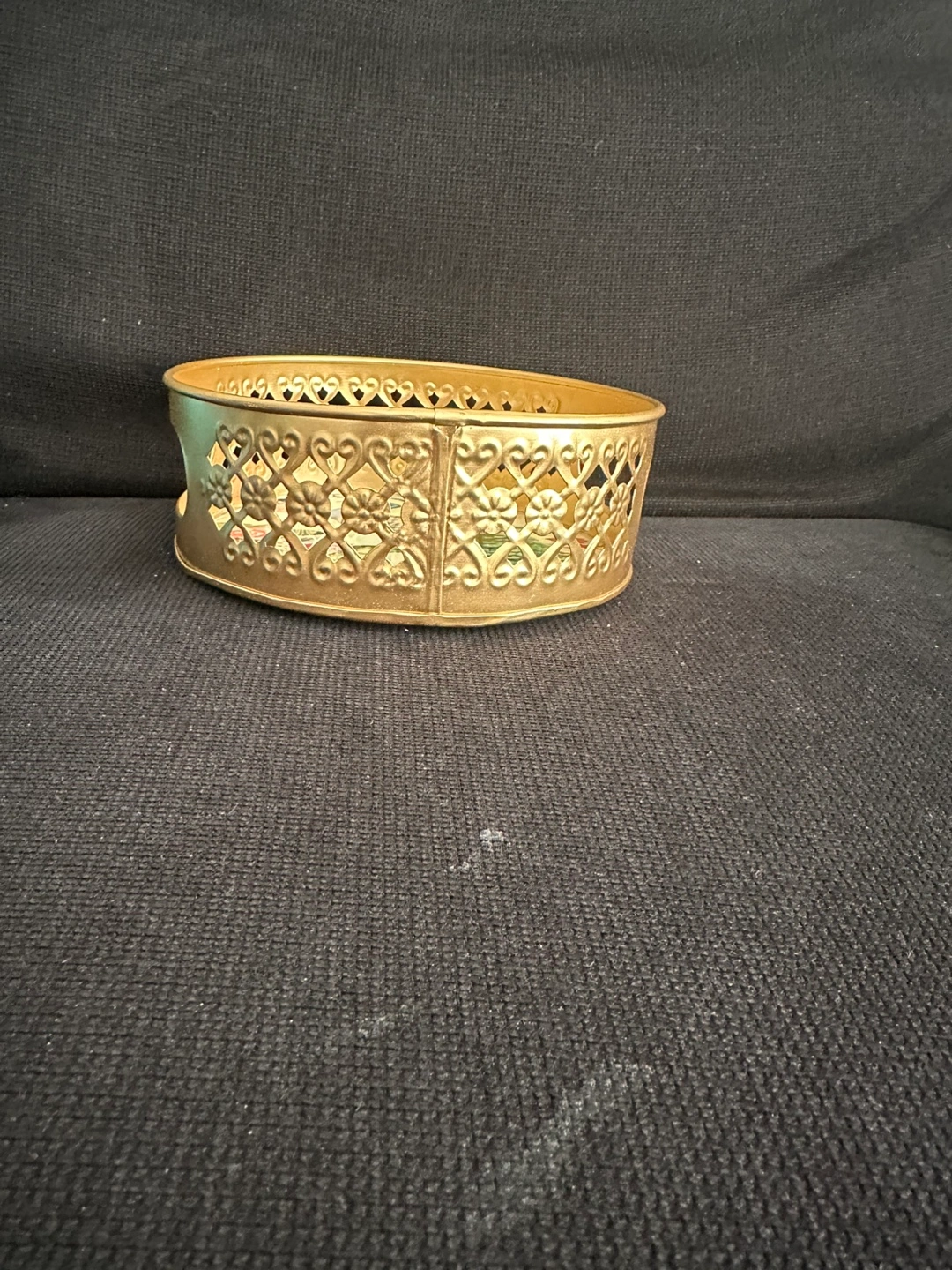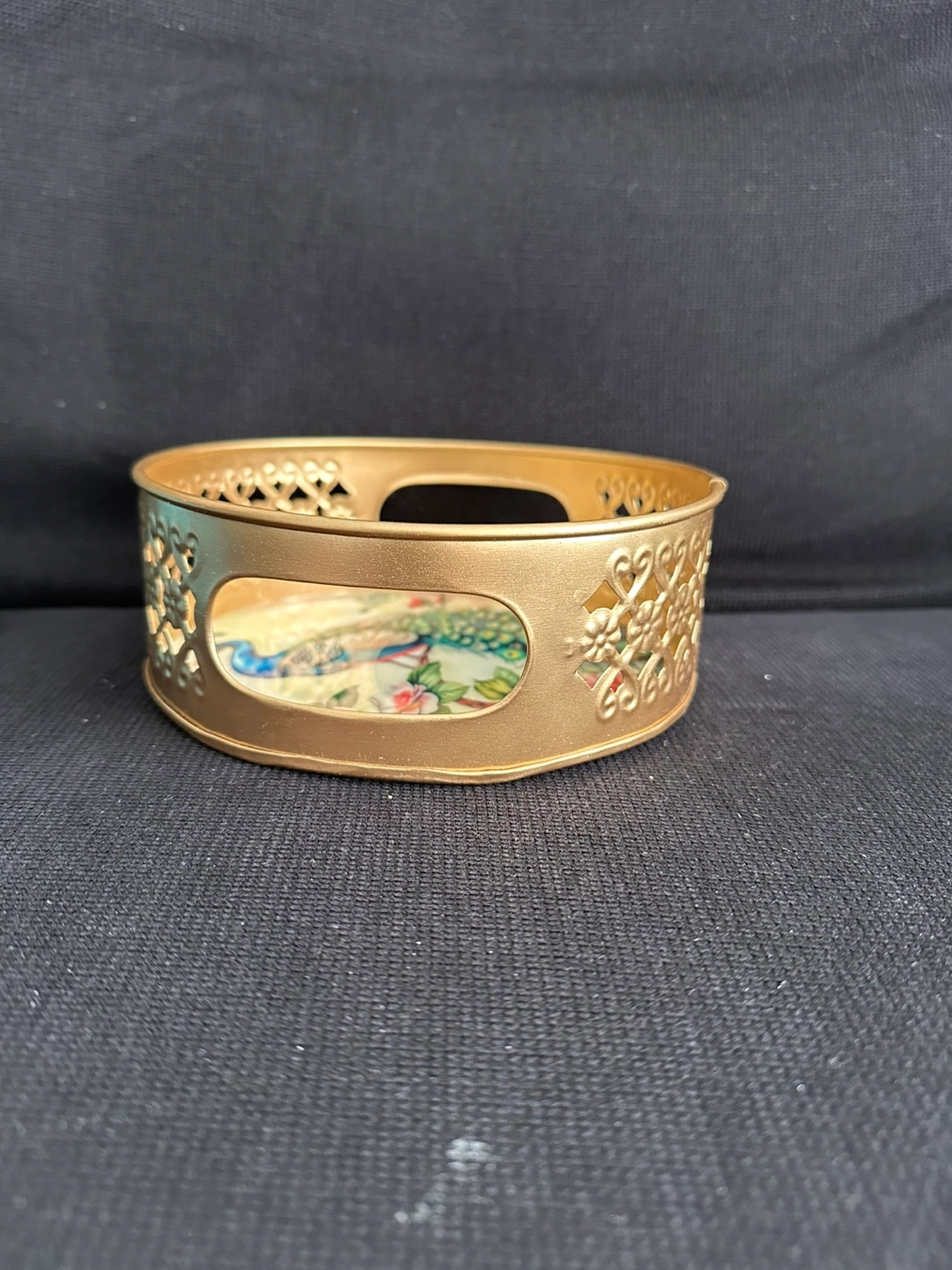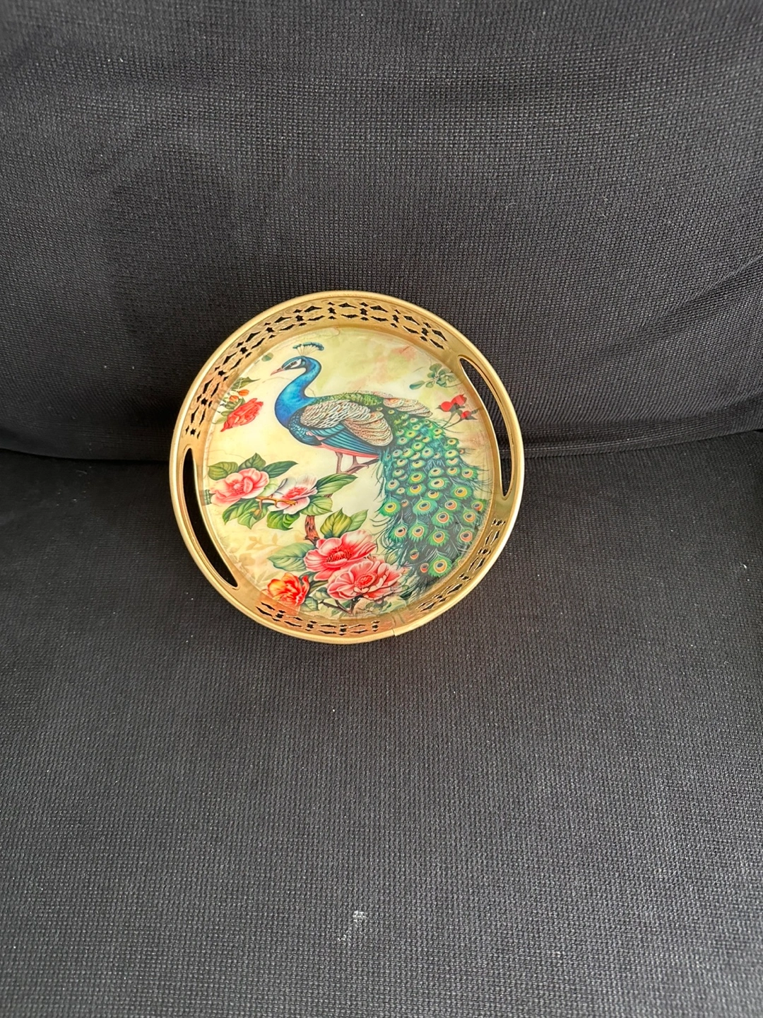 Ornate gold metal tray. Features a colourful peacock design. Intricate cut-out detailing around the rim. Perfect for serving or display. Pickup in Markham - Markham Rd & 16th Avenue. Smoke free, pet free environment.