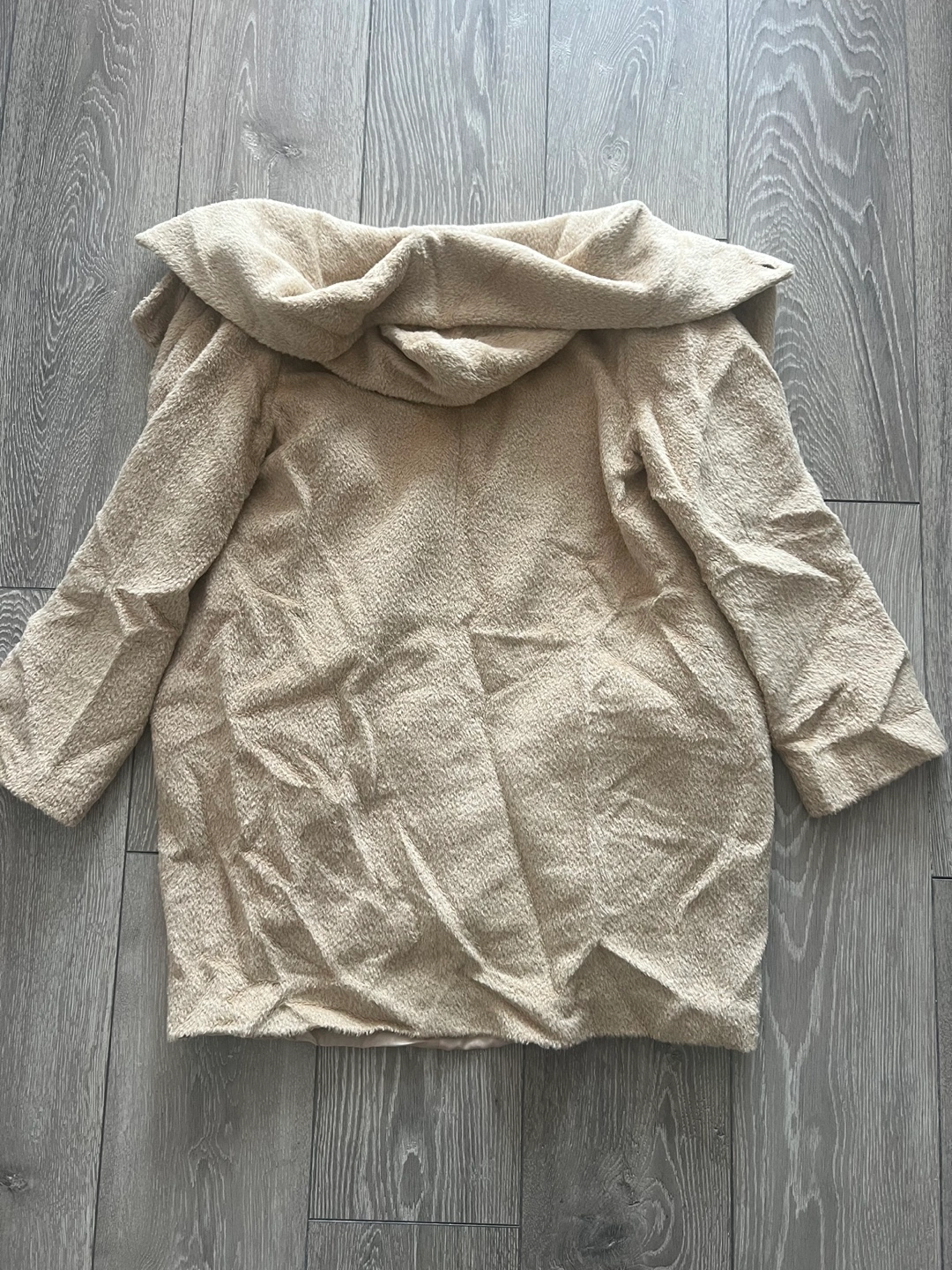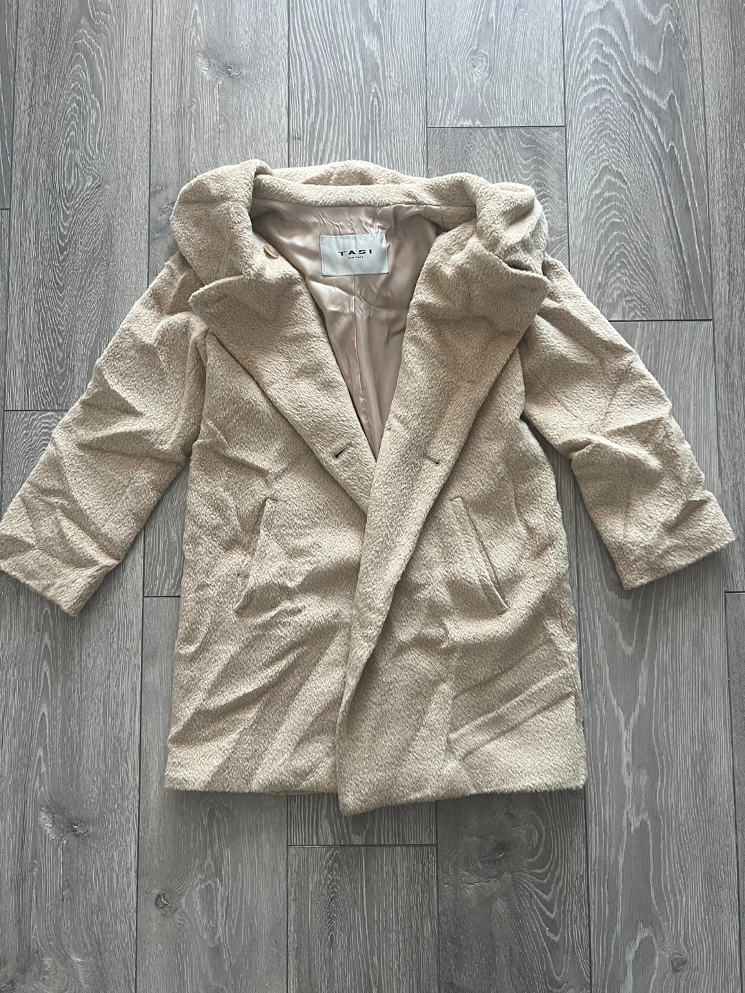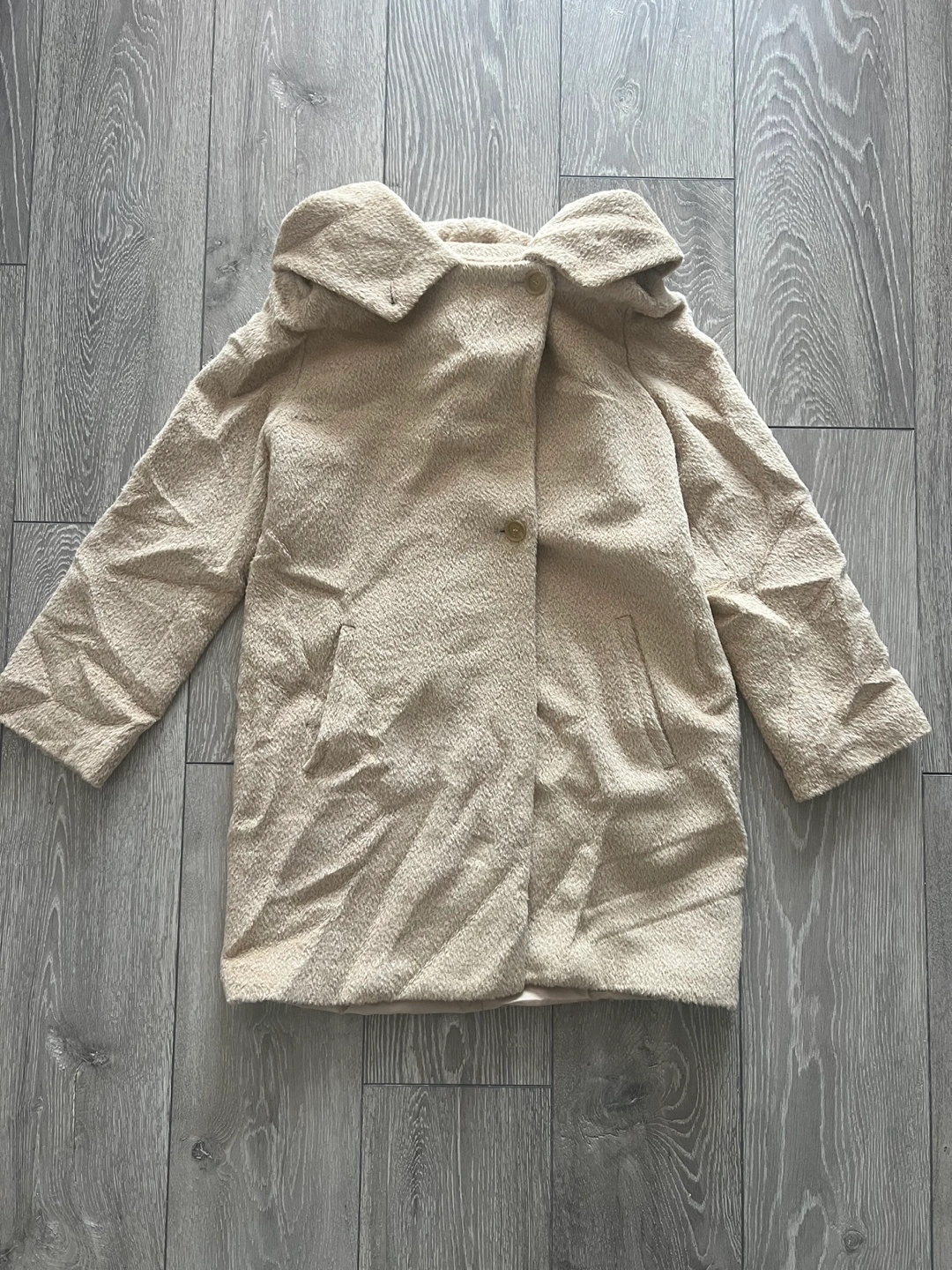 Women's beige teddy coat. Features a large collar, button closure, and pockets. It’s wrinkled from storing but in a great condition!