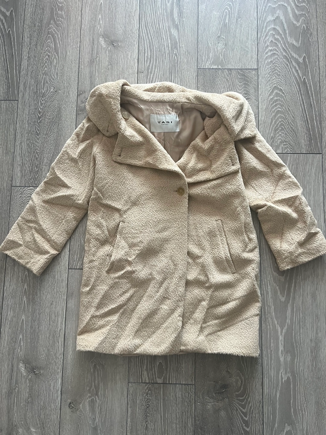 Women's beige teddy coat. Features a large collar, button closure, and pockets. It’s wrinkled from storing but in a great condition!