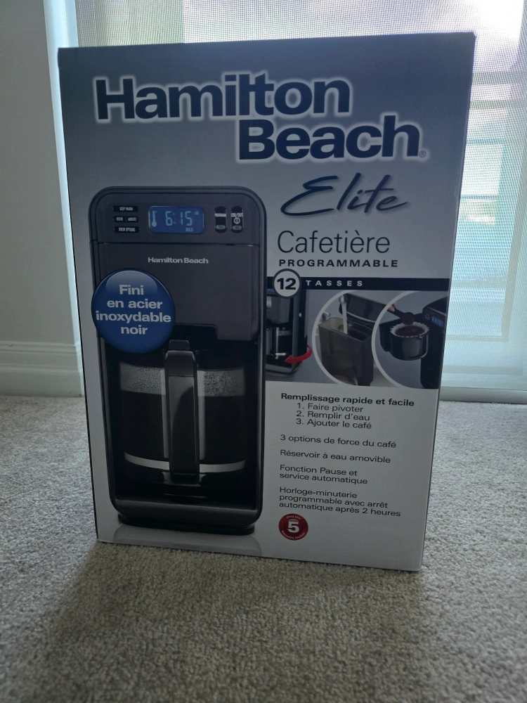 New in box, 12-cup programmable coffee maker. Features easy-access design, adjustable warm & brew options, removable water reservoir, and a mess-free pouring design. Black stainless steel finish.