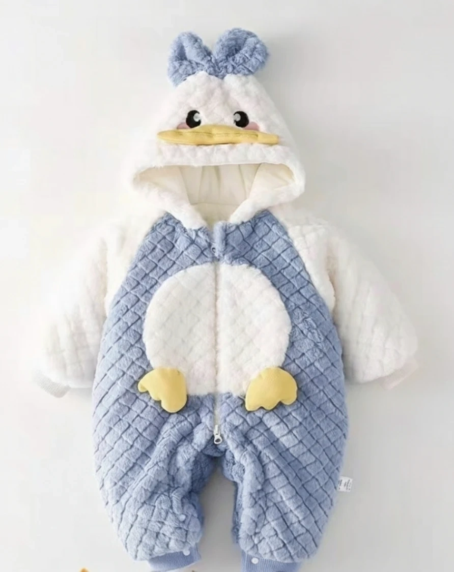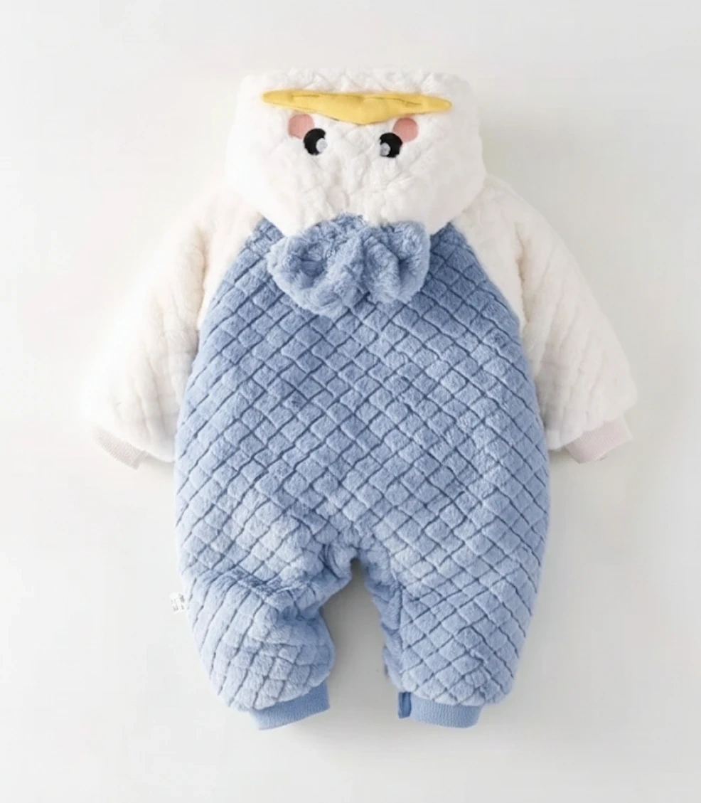 Super cute baby snowsuit. Features a duck design, soft plush material, and a zipper closure. Suitable for colder weather.