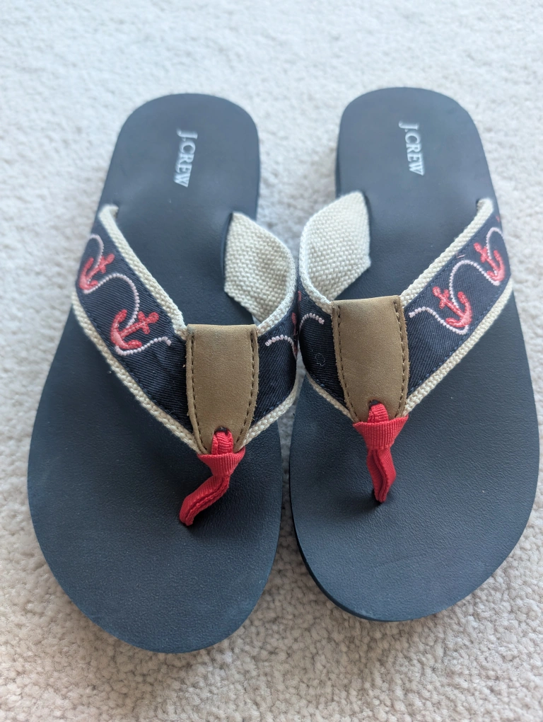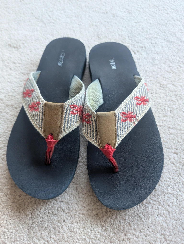 272 Pairs of J.Crew flip flops. Features nautical designs: anchors on one pair, lobsters on the other. Navy soles, fabric straps. Pre-owned, good condition. $5 per pair or take both pair for $8.
