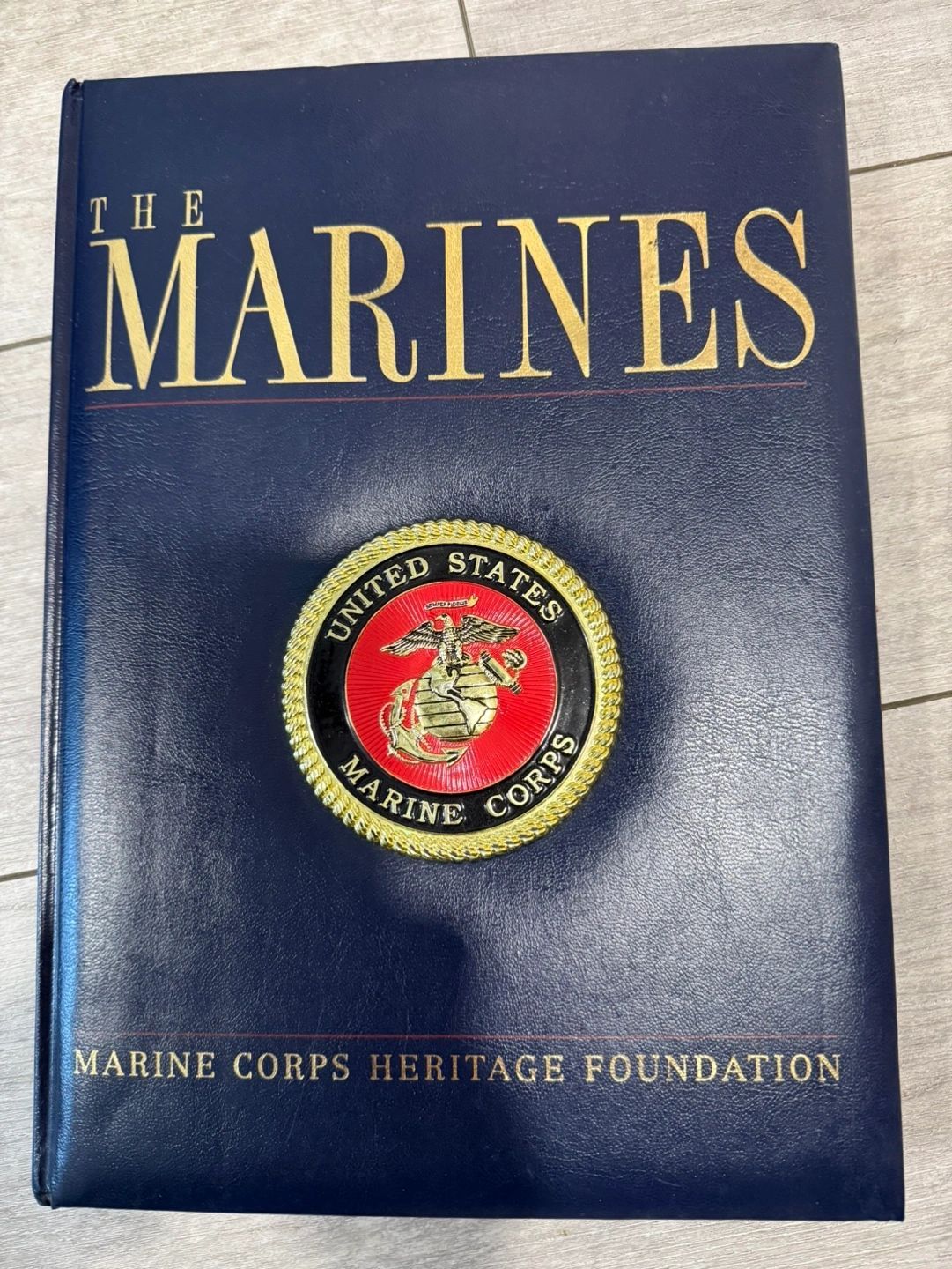 Hardback book, navy blue cover. Features the Marine Corps emblem. Published by Barnes & Noble and Rizzoli International Publications. Includes history and information about the Marines.