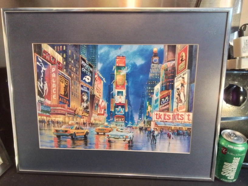 Beautiful framed print depicting Times Square at night. Vibrant colours, detailed artwork. Shows various Broadway shows and advertisements. Perfect for a theatre lover or anyone who appreciates cityscapes.