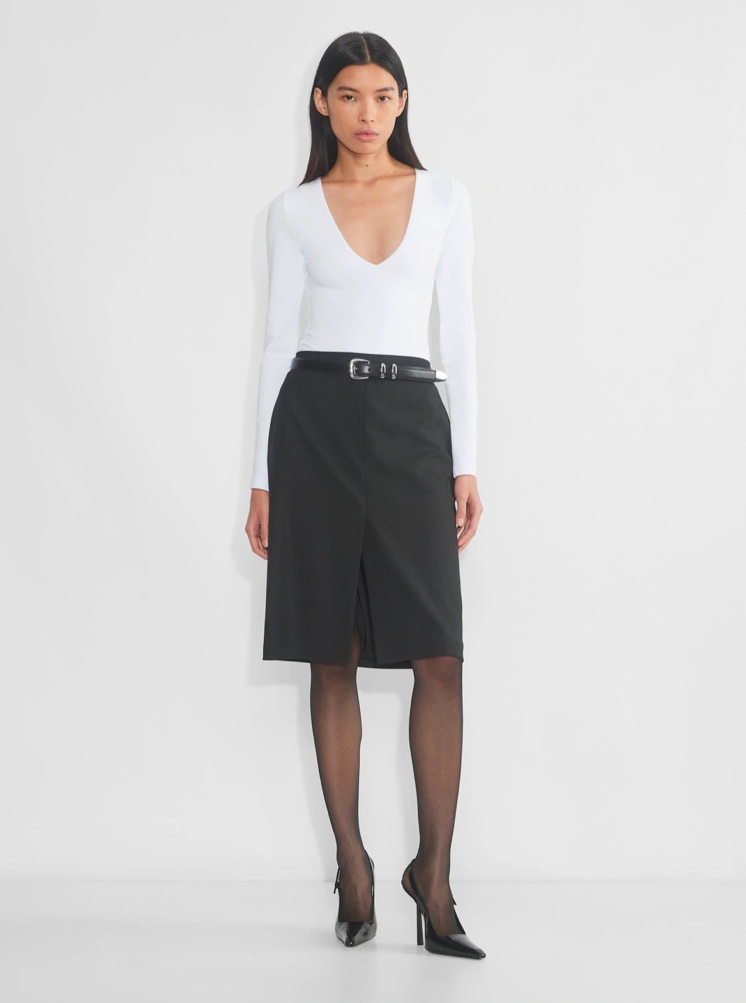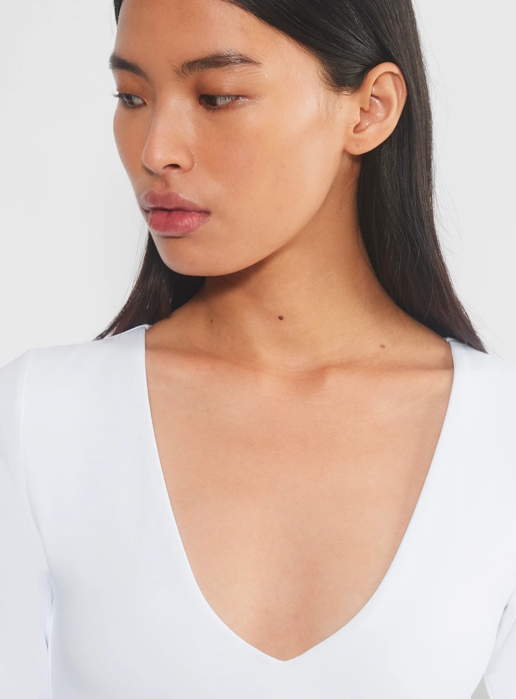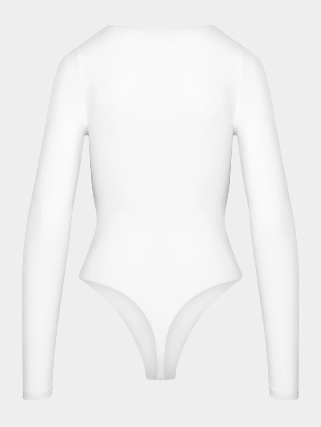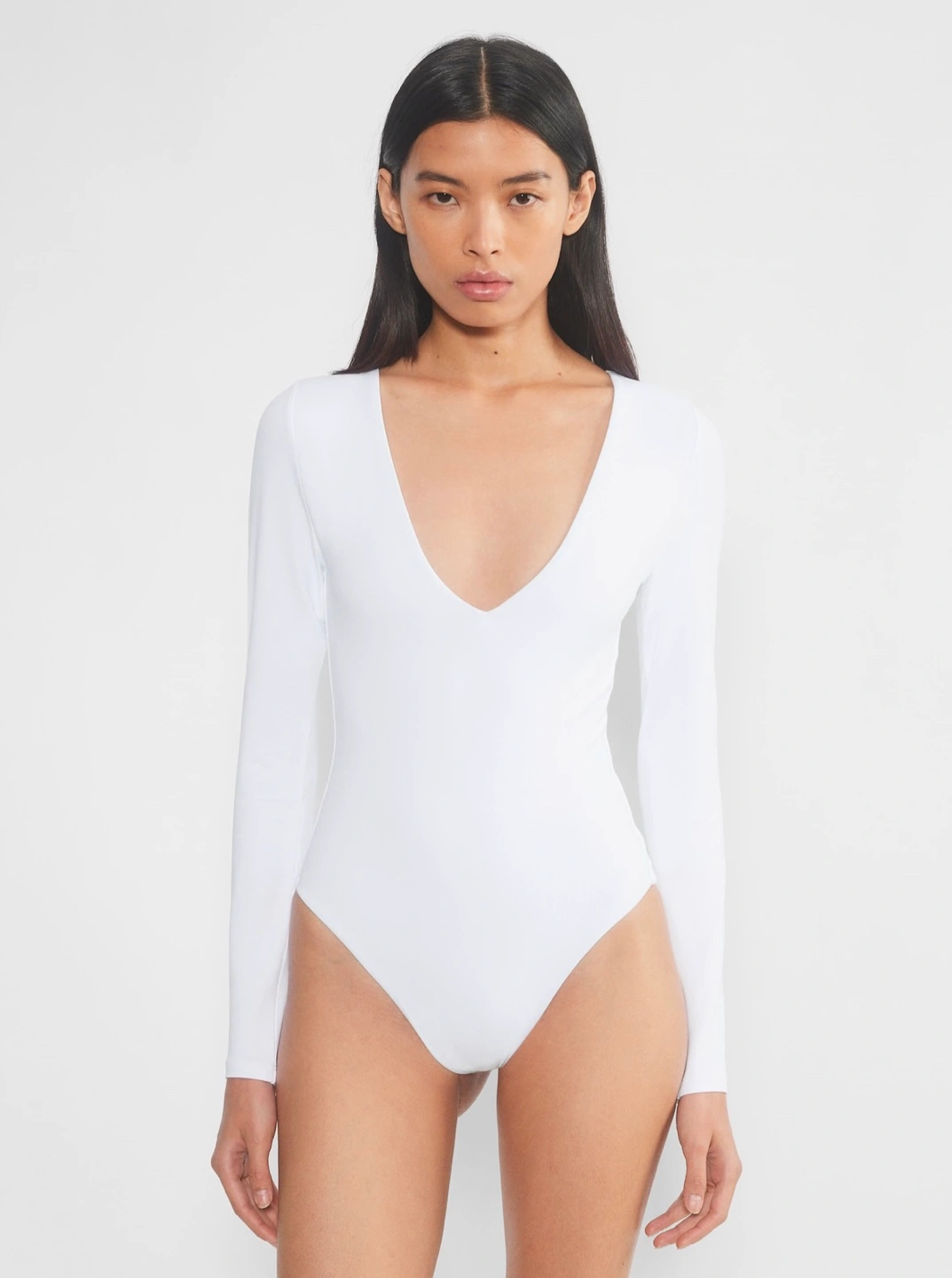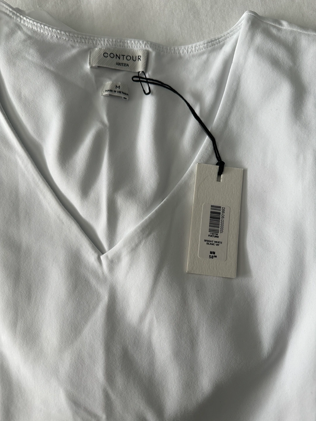 258Brand new with tags. Colour: bright white Size: Medium This is a V-neck longsleeve bodysuit with a thong-cut bottom and double-layer fabric for a supportive fit. It’s made with Aritzia’s Contour — luxe, ultra-flattering fabric coveted for its smoothing effect and second-skin feel. Nothing more essential. Snap clossure gusset. 84% Nylon, 6% elastane