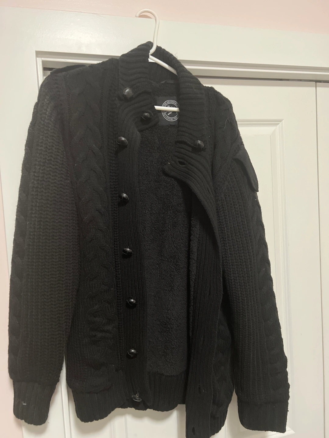 Warm black cable knit cardigan. Features a fleece lining, button closure, and pockets. Good for colder weather.