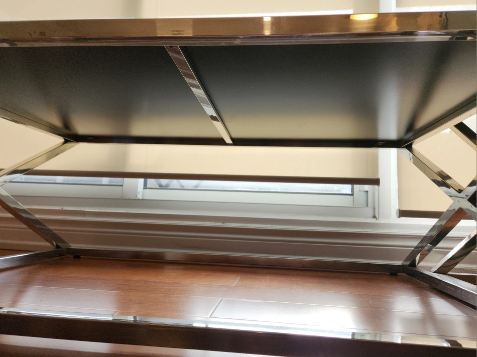 Stunning Italian-made coffee and end table set. Features black glass tops and polished chrome frames. Modern and elegant design. Perfect for contemporary living spaces.