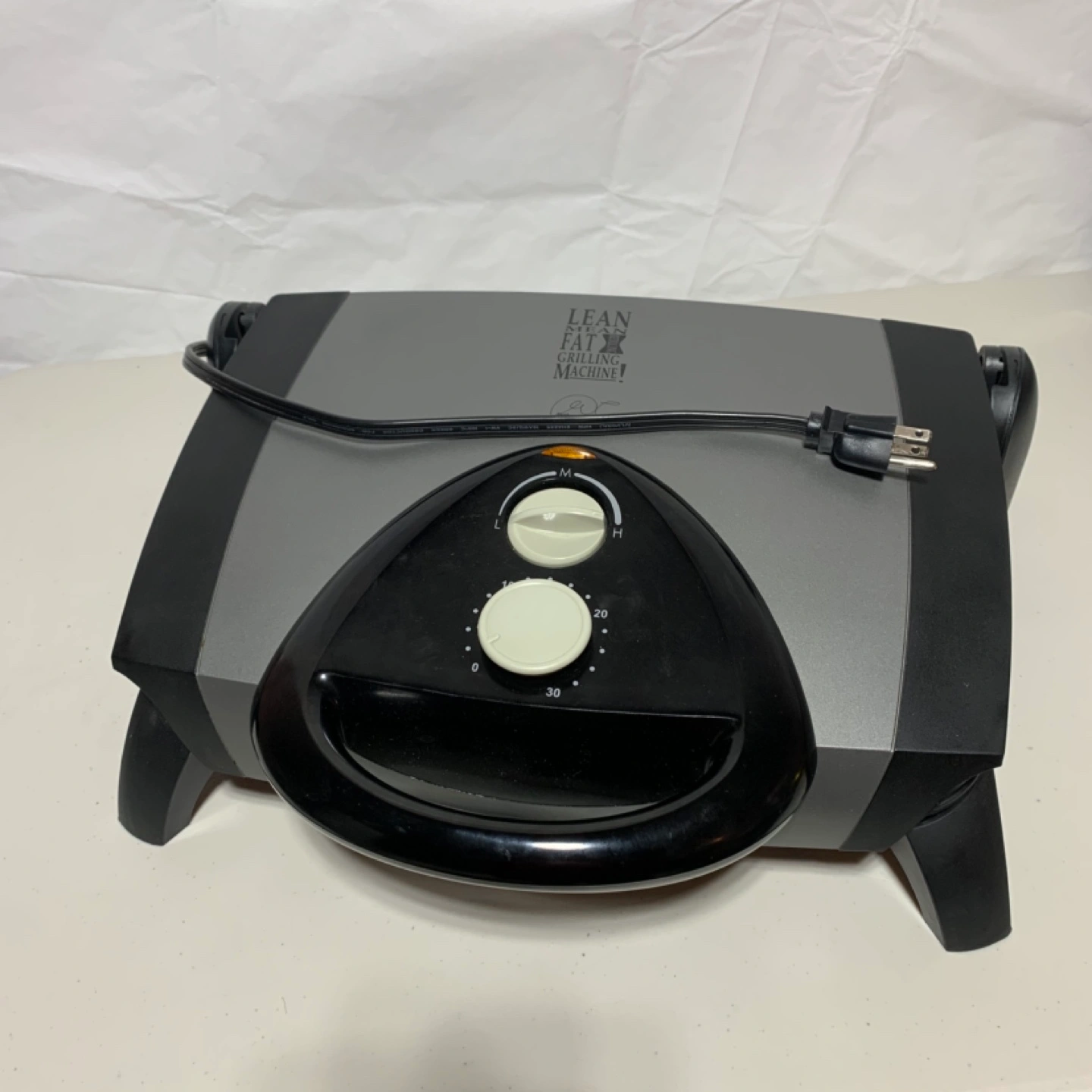 Pre-owned George Foreman Lean Mean Fat Reducing Grilling Machine. Features adjustable temperature control and non-stick grilling surface and timer. Great for healthy cooking. comes with two drip tray and two cleaning spatula. has minor cosmetic wear. in excellent working condition.